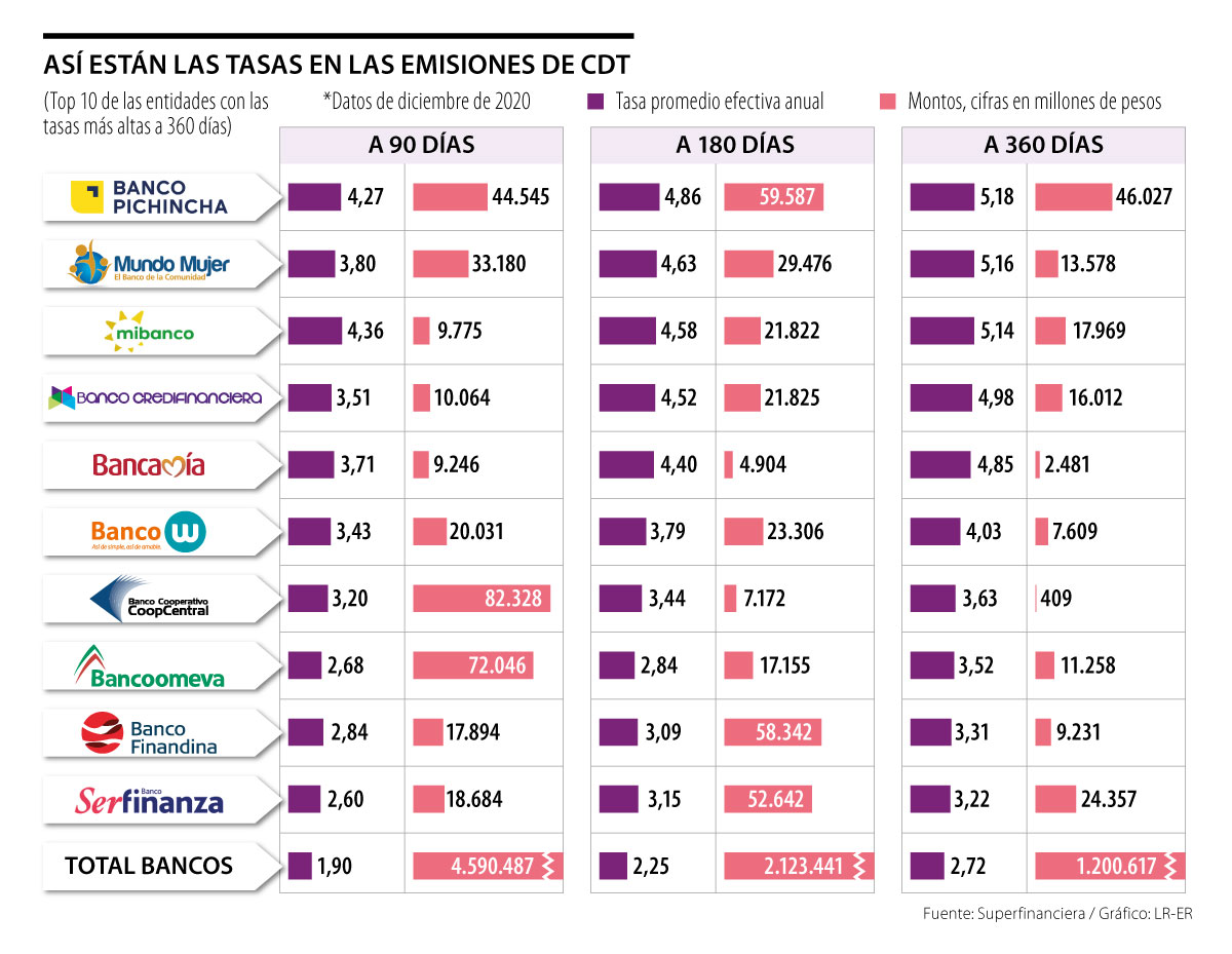 Para aquellos consumidores que están interesados en ahorrar en un CDT a un plazo menor, no pueden perder de vista que la tasa promedio de interés para estos productos a 90 días está en 1,90% y para los de 180 días se ubicó en 2,25% a diciembre. Las entidades bancarias que ofrecen las mayores tasas en los CDT de tres meses son Mibanco, con 4,36%; Banco Pichincha, con 4,27%; y Banco Mundo Mujer, con 3,80%. Las entidades del sistema bancario que tienen las mayores tasas en los CDT a seis meses son las mismas, pero en el siguiente orden: Banco Pichincha (4,86%), Banco Mundo Mujer (4,63%) y Mibanco (4,58%).