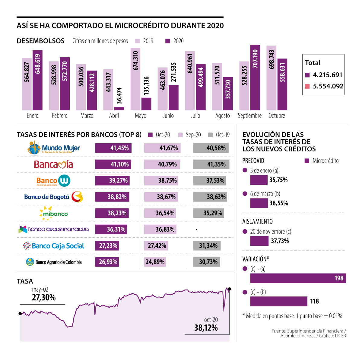 A medida que se agudizaba la crisis económica y sanitaria desatada por la pandemia del covid-19, los desembolsos de microcrédito registraron caídas de hasta 94,3%, ya que, por ejemplo, pasó de $648.619 millones en enero a $36.474 millones en abril de este año. Sin embargo, con la reapertura, los desembolsos se recuperaron y alcanzaron $558.631 millones en octubre.