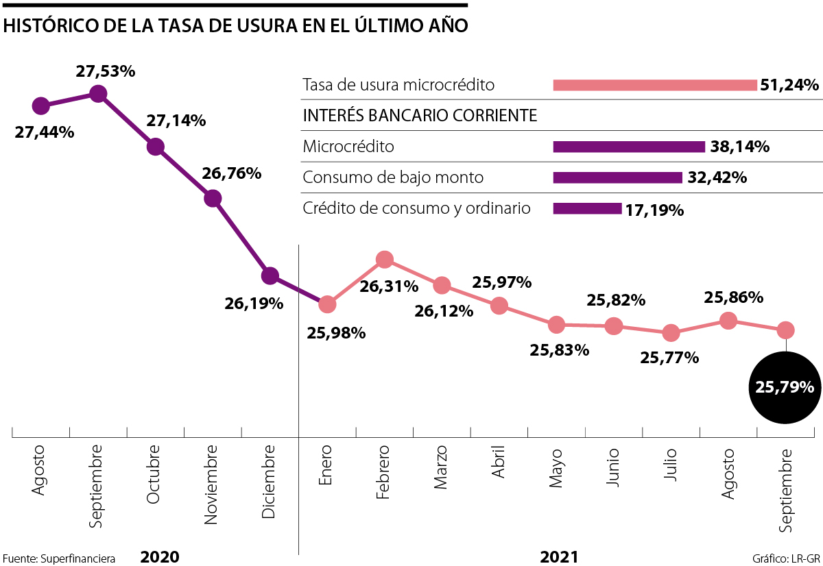 La Superintendencia Financiera de Colombia (SFC) reveló que la tasa de usura para septiembre bajó a 25,79%. El indicador retrocedió siete puntos básicos si se compara con la tasa de agosto (25,77%), mes cuando el indicador subió por primera vez desde febrero.
