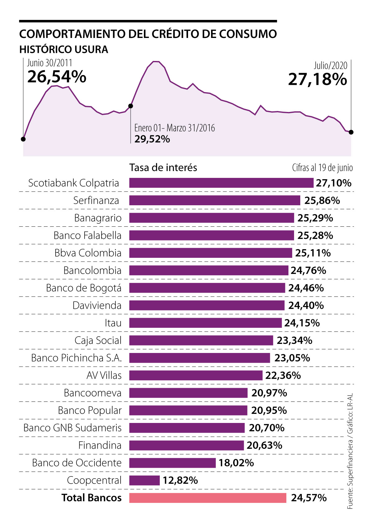 LR analizó las cifras del regulador y elaboró el escalafón de los bancos más cercanos y alejados de la usura. En general, el promedio de cobro en intereses en los 18 bancos que ofrecen el servicio de tarjetas de crédito es de 24,57%, es decir, solo 2,61 puntos porcentuales (pps) por debajo del nivel de usura.