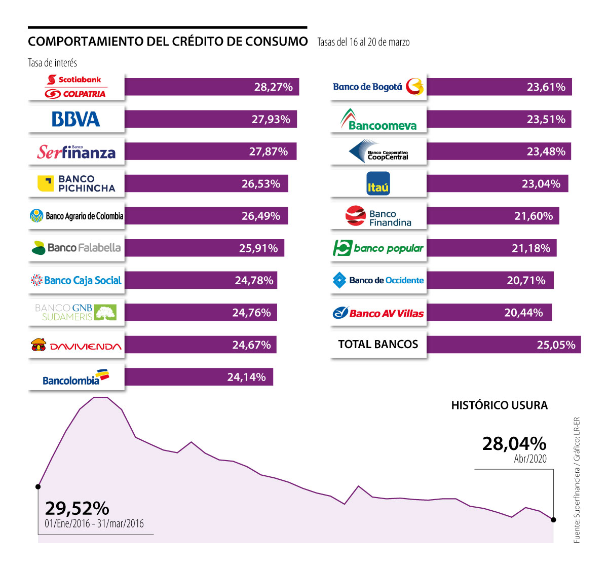 Por otro lado, los bancos que más se acercan a la nueva tasa de usura son Bbva, con 27,93%; seguido por Banco Serfinanza, cuya tasa es de 27,87%, y en tercer lugar está Banco Pichincha, que cobra 26,53%.