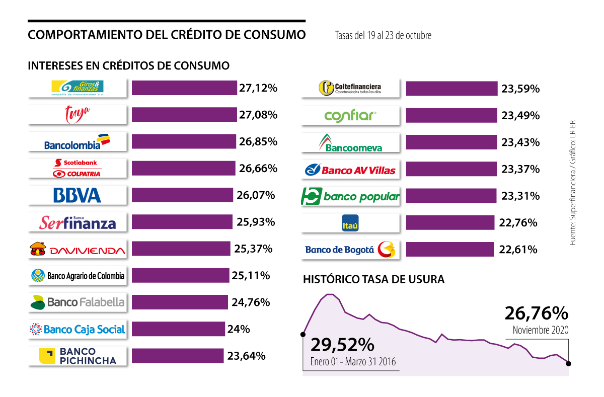 Las entidades financieras que más se acercan a la nueva tasa de usura son Scotiabank Colpatria, con 26,66%; seguido por Bbva Colombia, cuya tasa es de 26,07%, y en tercer lugar está Banco Serfinanza, que cobra 25,93%.