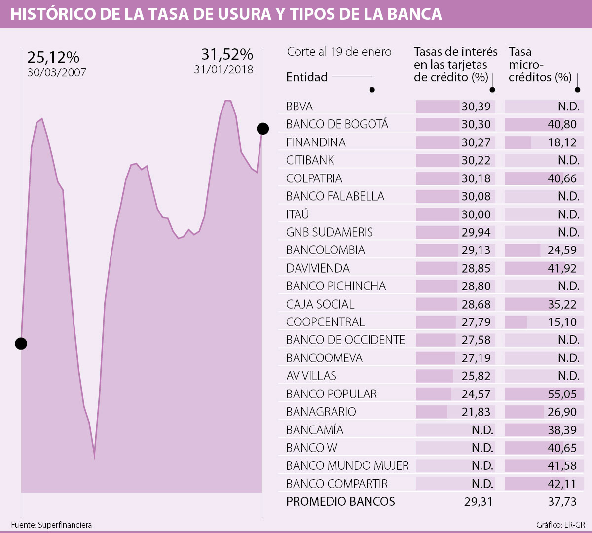 Al momento de revisar el último reporte de tasas de interés de los bancos en tarjetas de crédito, con corte del 19 de enero, Bbva aparece como el más cercano al nuevo limite con tipos de 30,39%, luego Banco de Bogotá (30,30%) y Finandina (30,27%). El promedio de los establecimientos bancarios es de 29,31%, cifra que ha bajado 2,36 puntos porcentuales en 12 meses.