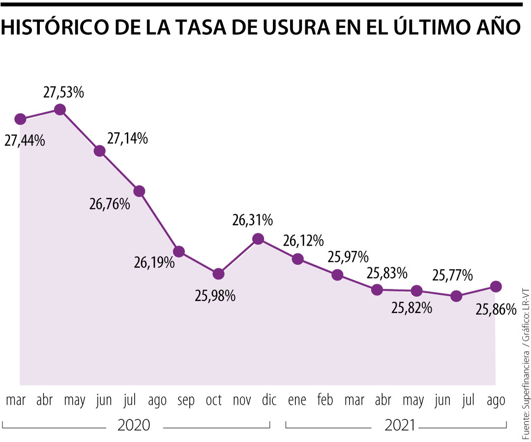 La Superintendencia Financiera de Colombia (SFC) reveló que la tasa de usura para agosto subió a 25,86%. El indicador avanzó nueve puntos básicos si se compara con la tasa de julio, mes en el que se ubicó en 25,77%.