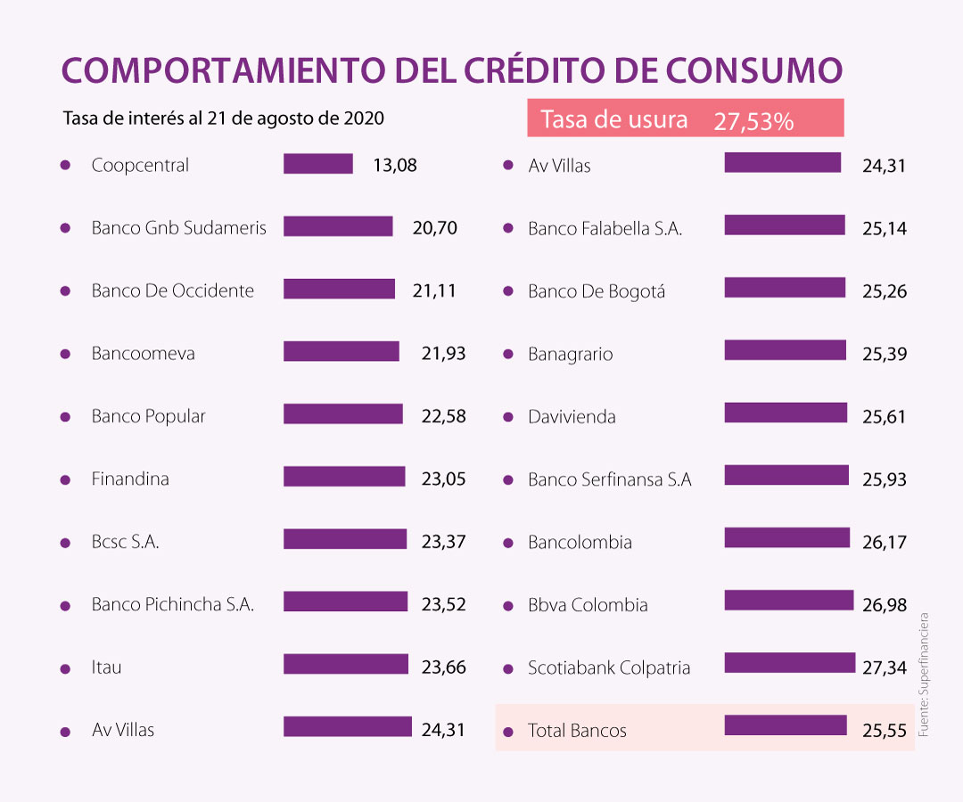 Al 21 de agoto, la tasa promedio total que maneja la banca es de 25,55%, es decir 1,89 puntos por debajo de la usura para septiembre. Sobre esto, Alfredo Barragán, experto en banca de la Universidad de los Andes, explicó que "los bancos aún no han trasladado los menores costos de fondeo en su intento de aumentar provisiones de cartera previendo alto deterioro. A esto se le suma que tampoco hay desembolsos de crédito a tasas más bajas que hagan que pondere las tasas hacia abajo".