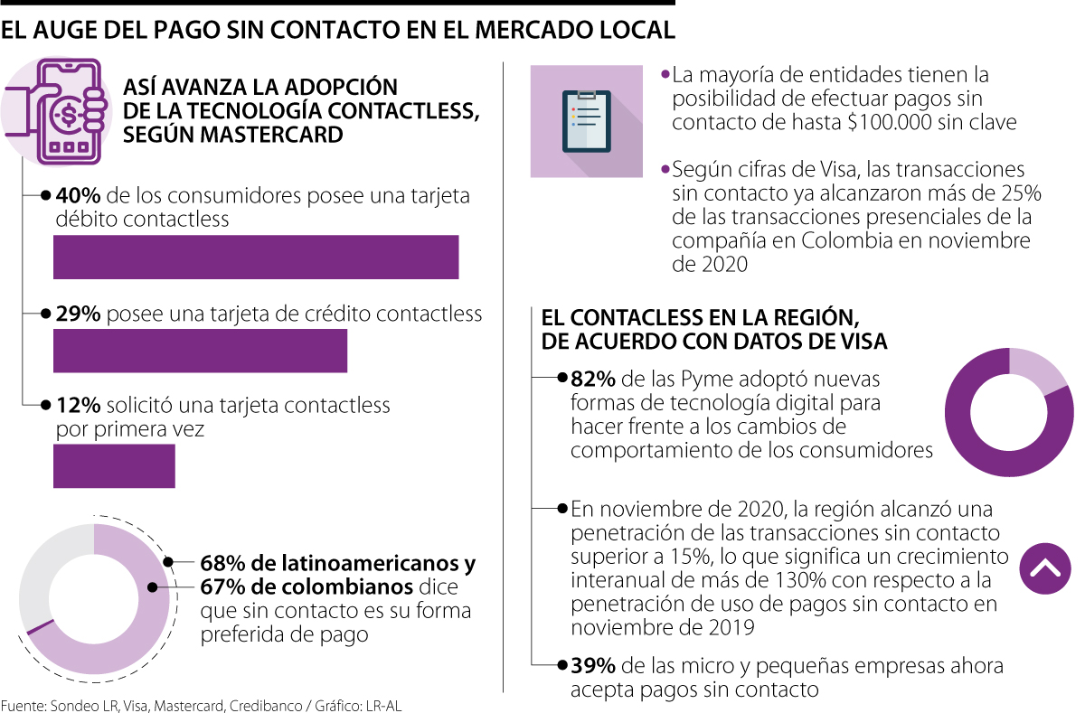 A esto se le suma que 68% de latinoamericanos y 67% de colombianos dice que sin contacto es su forma preferida de pago, destacó un estudio de Mastercard que también resaltó que 40% de los consumidores posee una tarjeta débito contactless, 29% posee una tarjeta de crédito contactless y 12% solicitó una tarjeta contactless por primera vez.