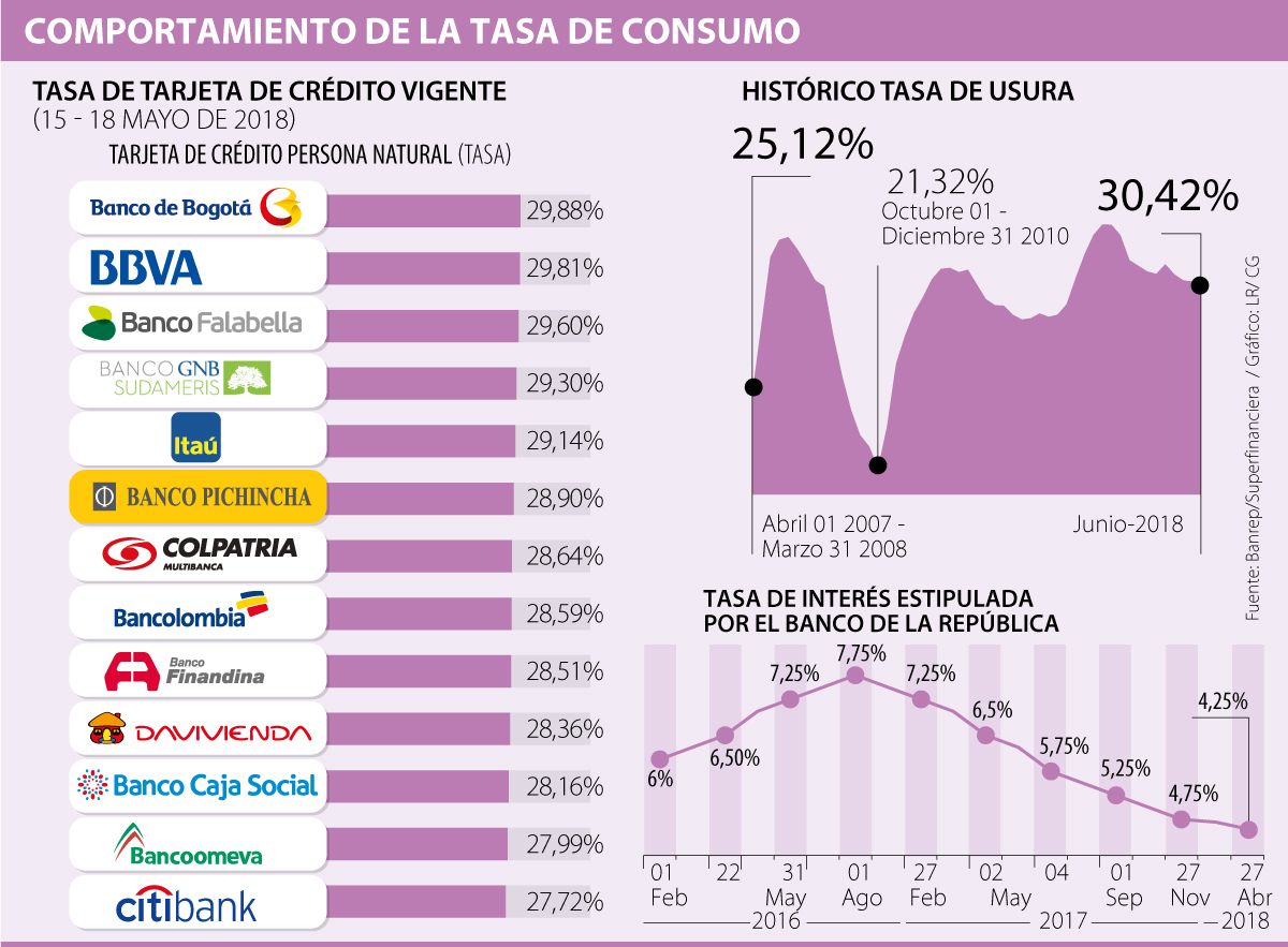 A finales de 2016 el Banco de la República inició un ciclo de bajas en la tasa de interés, con el objetivo de incentivar el consumo en los hogares, ritmo que las entidades bancarias han intentado seguir. Durante enero de 2017 y mayo de 2018 el Emisor ha disminuido en 350 puntos básicos sus tasas, pasando de 7,75% a 4,25%, y por su parte la tasa de usura, que se entiende como el máximo cobro que las entidades financieras pueden poner a un crédito, ha tenido un comportamiento similar al presentar una caída de 309 puntos básicos en ese mismo periodo.