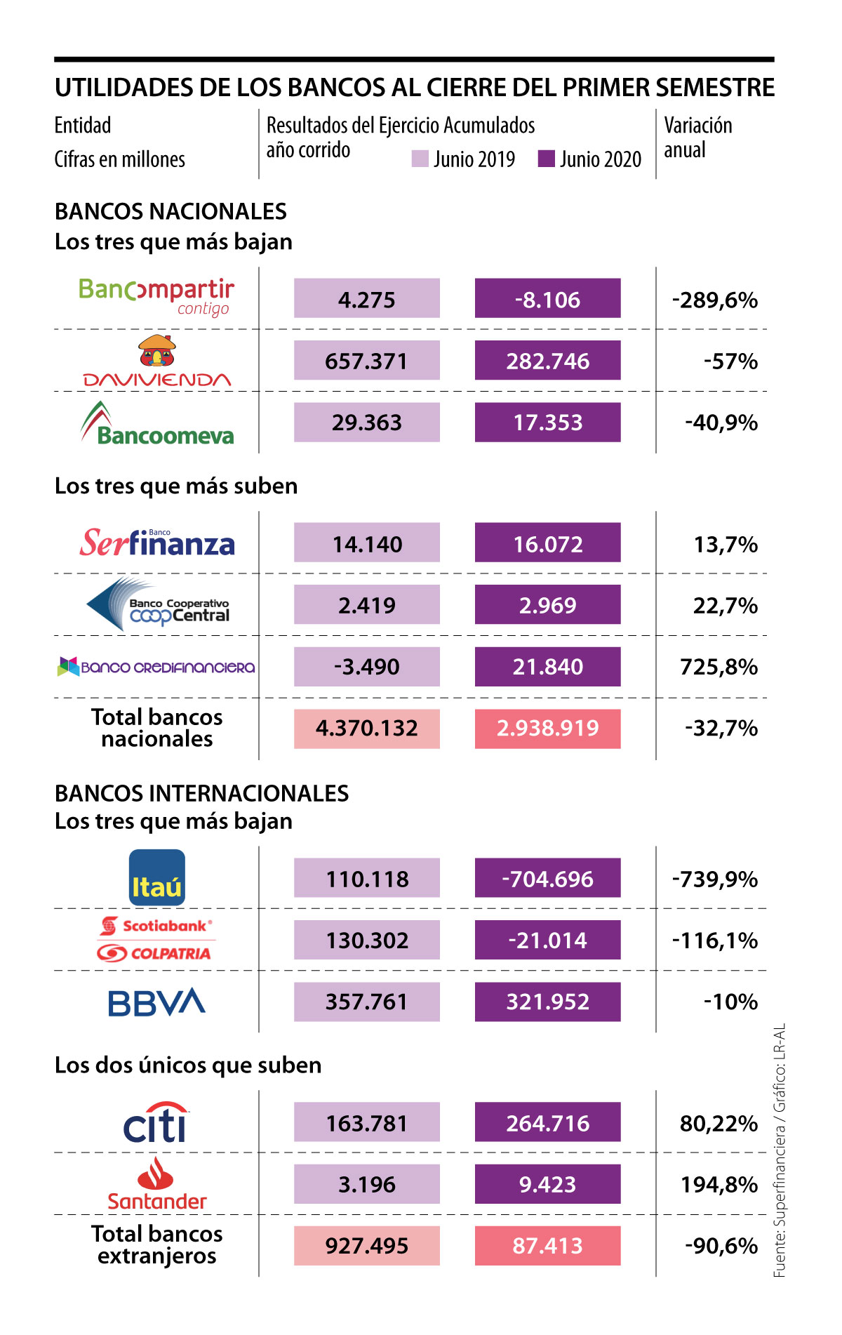 Los bancos nacionales que jalonaron este desplome del semestre fueron BanCompartir, con -289,6%, y Davivienda, con -57,0%