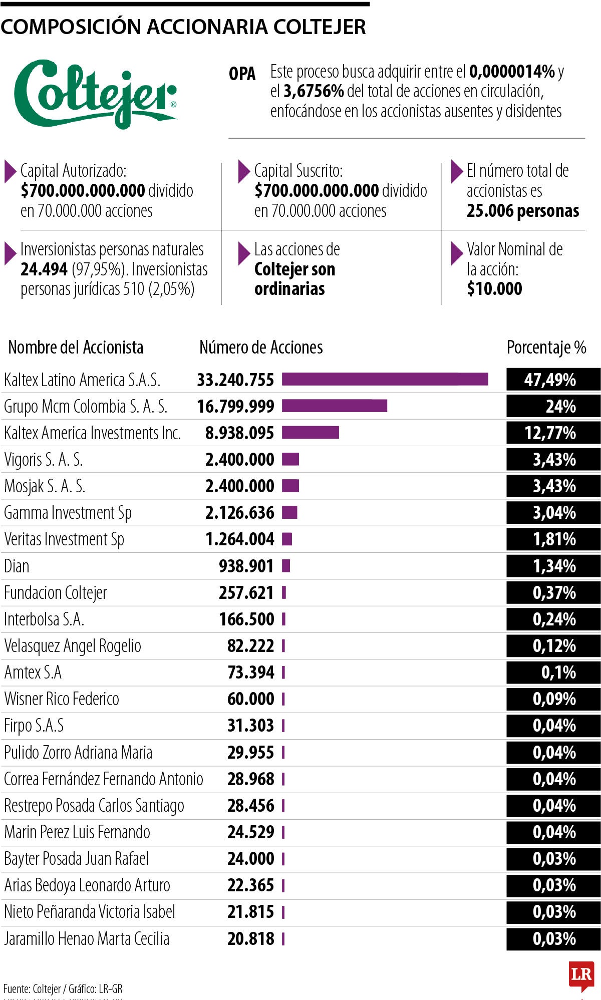El precio propuesto por acción es de $1.812, pagadero en efectivo en moneda colombiana. Como parte del procedimiento regulatorio, la Superintendencia ordenó la suspensión de la negociación bursátil de las acciones de Coltejer hasta el día siguiente a la publicación del aviso oficial de la oferta.