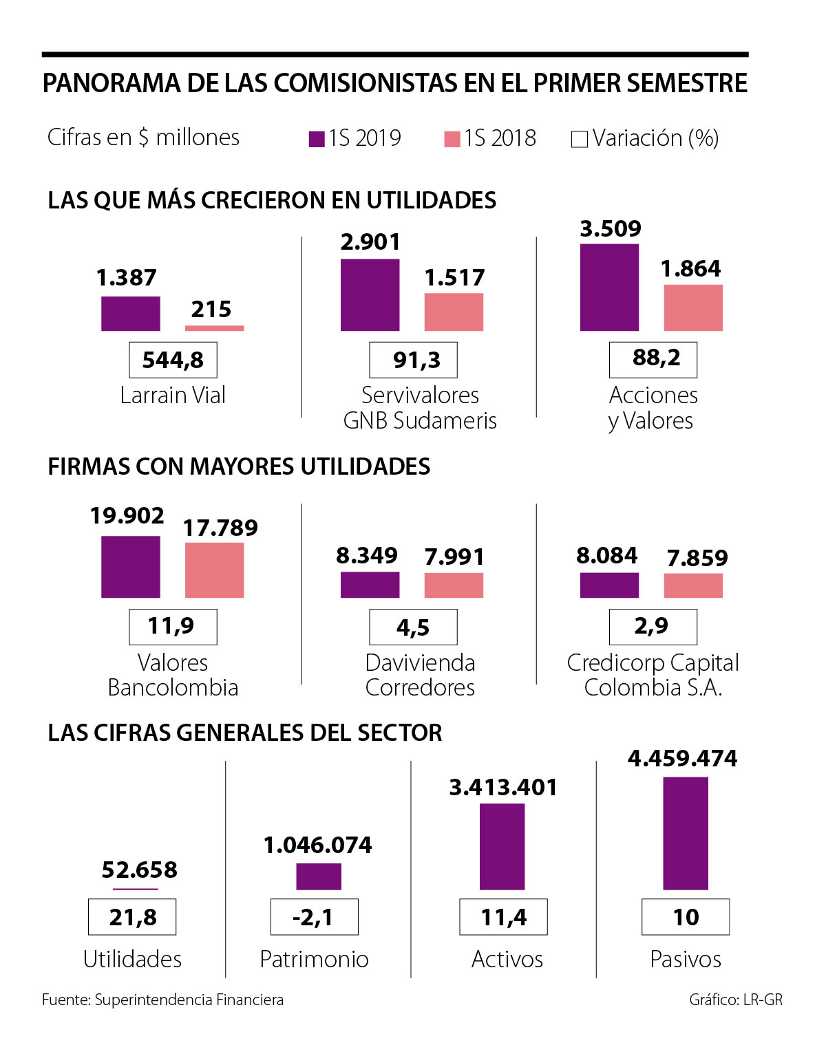 Durante el primer semestre las comisionistas que lograron mayores utilidades fueron: Valores Bancolombia con $19.902 millones (11,9% más frente al mismo periodo del año anterior), Davivienda Corredores, con $8.349 millones (4,5%) y Credicorp Capital Colombia, con $8.084 millones (2,9%).