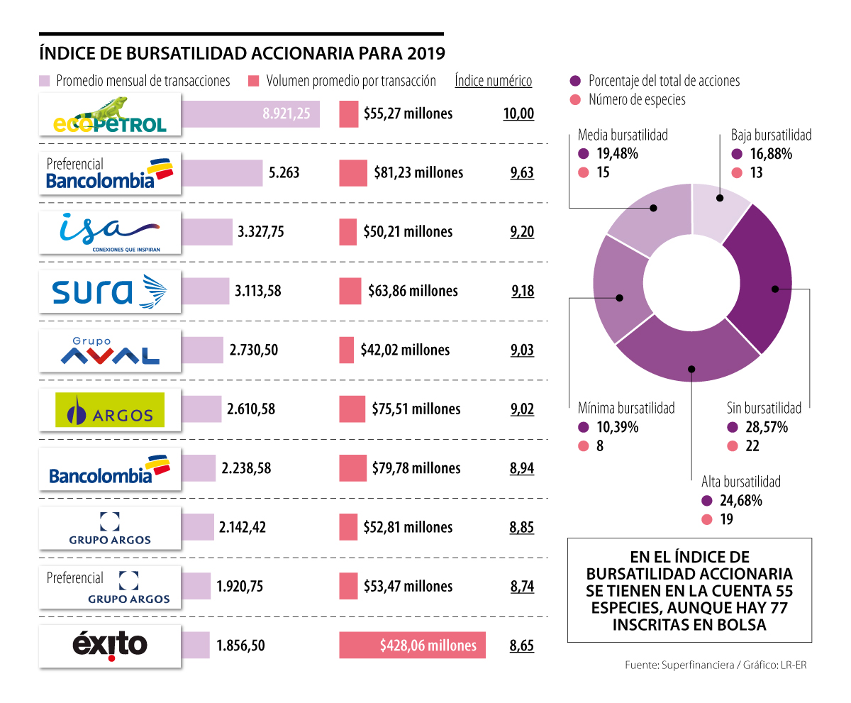 En mayor bursatilidad le siguen la acción preferencial de Bancolombia, con 5.263 transacciones promedio al mes y un volumen promedio de $81,23 millones por transacción, y la especie de ISA, que tuvo 3.327,75 transacciones mensuales en promedio y $50,21 millones promedio por transacción.