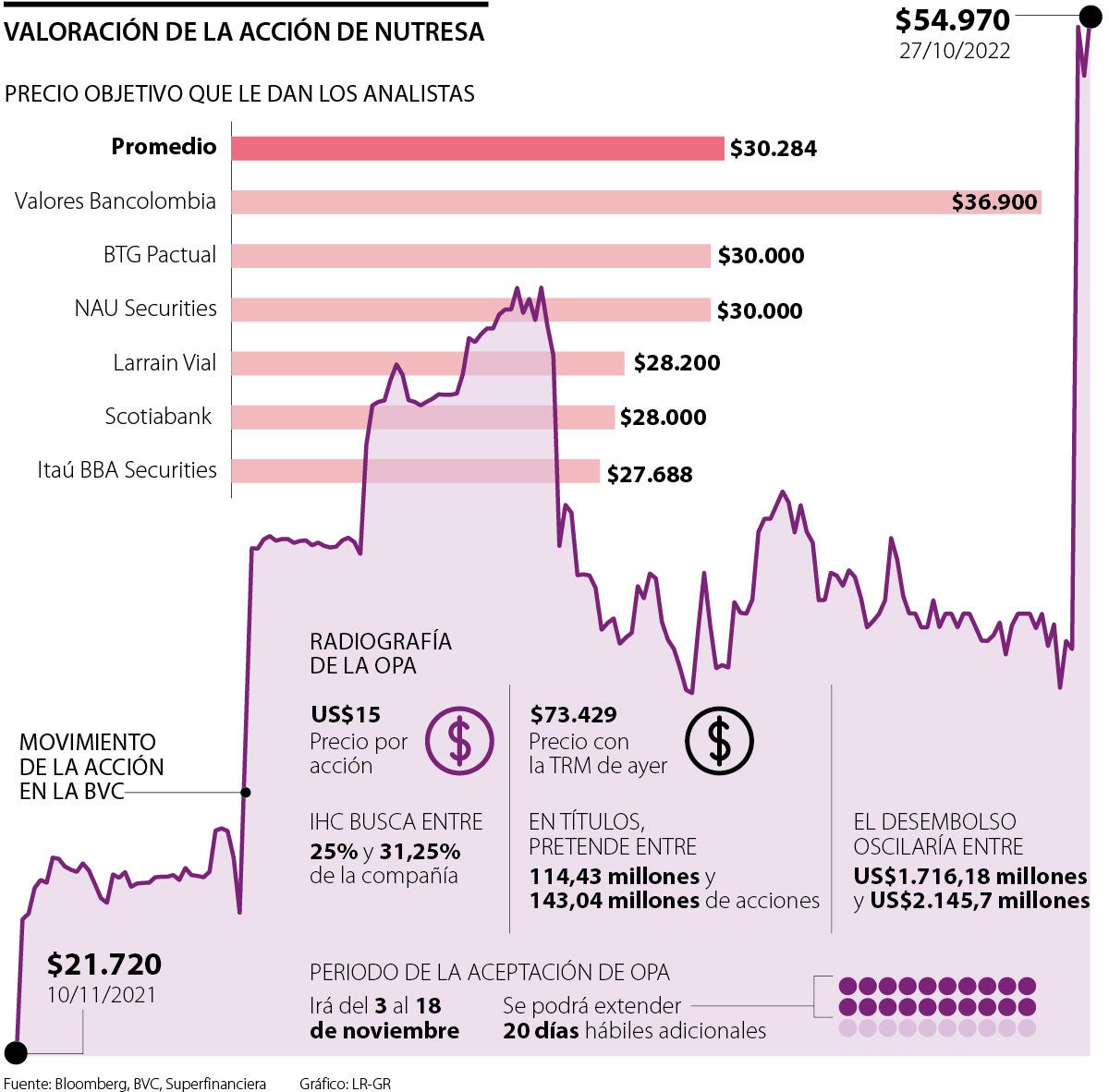 El grupo árabe International Holding Company (IHC) publicó, el 19 de octubre, que recibirá ofertas entre el 3 y el 18 de noviembre a través de la Bolsa de Valores de Colombia (BVC) . IHC realizó la oferta para adquirir como mínimo 114,4 millones acciones ordinarias y en circulación del Emisor, que representan 25% del capital con derecho a voto con corte de 30 de junio de 2022; y como máximo 143 millones acciones ordinarias, es decir, 31,25% de las especies de Nutresa. Esta dispuesto a pagar US$15 por cada título de la multilatina de alimentos.