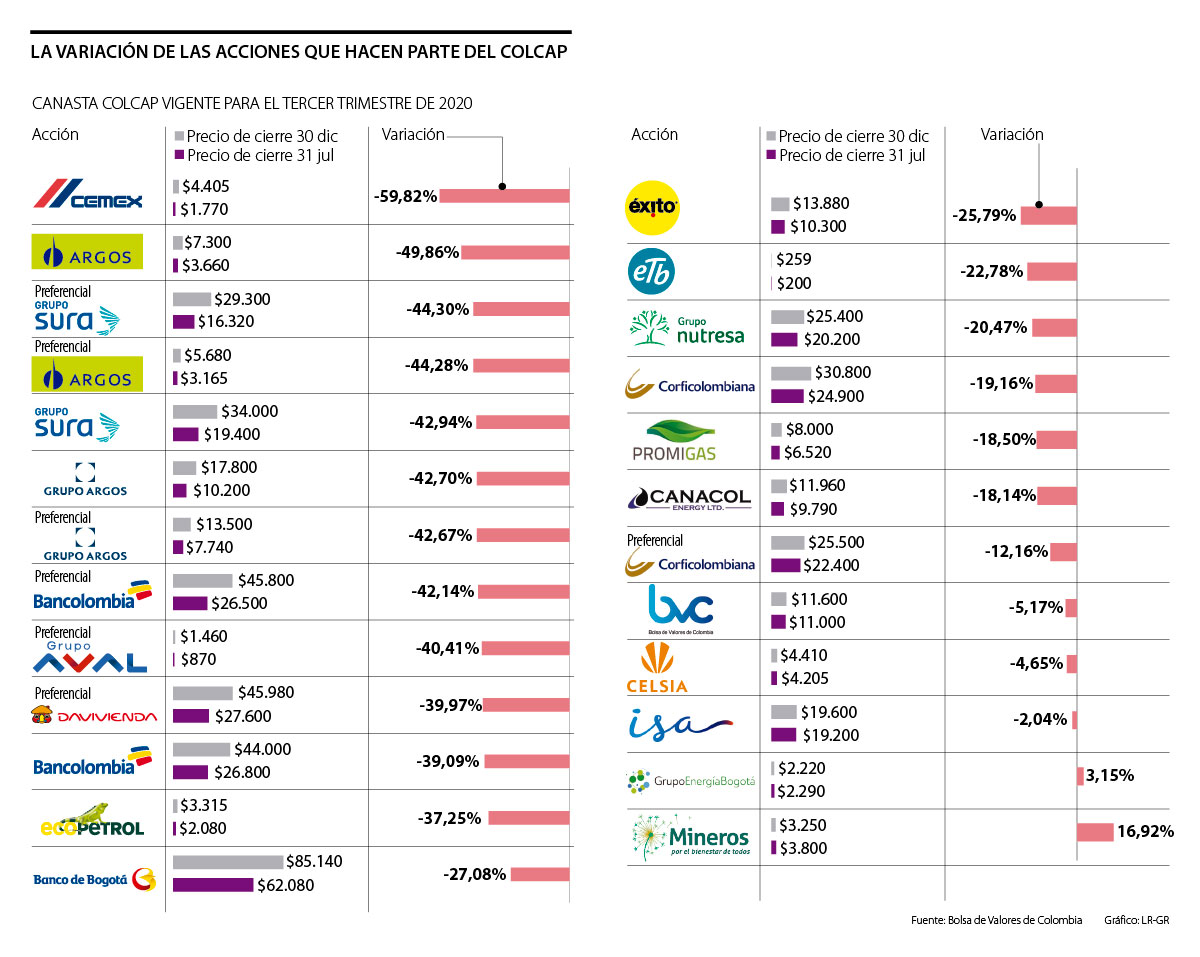 A pesar de que, en general, la Bolsa de Valores de Colombia (BVC) se ha recuperado tras el impacto de las caídas de marzo, las cuales fueron consencuencia de la propagación del covid-19 y la guerra de precios del petróleo entre Arabia Saudita y Rusia, el índice Colcap no ha vuelto al nivel con el que inició el año. De hecho, en los primeros siete meses de 2020, ha perdido 31,77% de su valor, pues pasó de 1.662,42 unidades a 1.134,34 unidades.