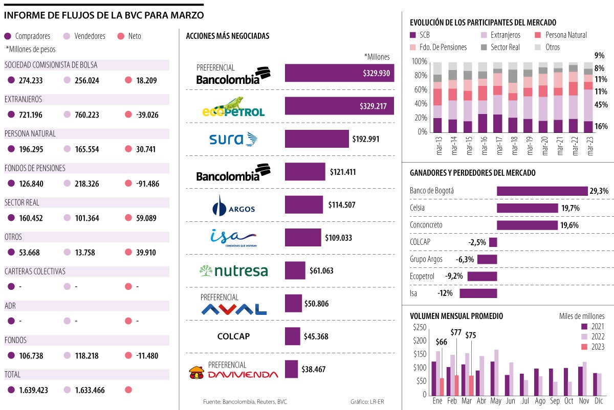 Los informes también destacaron que para marzo ya se empieza a evidenciar un mayor volumen de negociación frente a enero y febrero, con un promedio diario de $75.000 millones, a pesar de que este dato se encuentra aún por debajo del promedio de 2022.