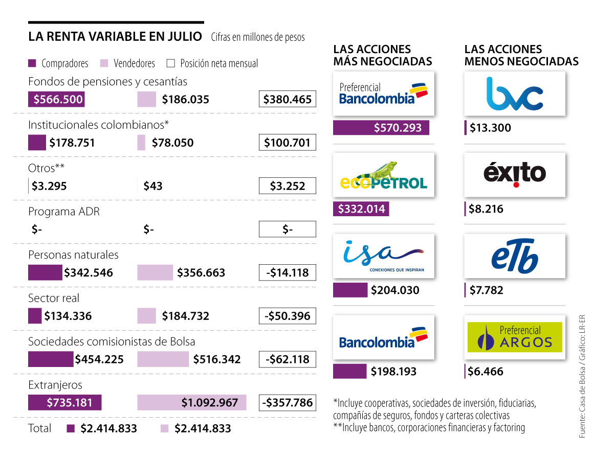 Las acciones que más vendieron los extranjeros en julio fueron ISA ($62.724 millones), preferencial de Grupo Aval ($50.965 millones) y Ecopetrol ($38.375 millones). Entre enero y julio, los inversionistas de otros países vendieron $2,59 billones en renta variable. Las especies de las que más salieron fueron preferencial Bancolombia ($756.000 millones) y preferencial Grupo Aval ($642.000 millones).