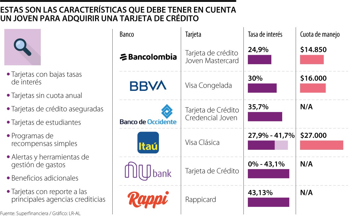 Dentro de las ofertas están bancos como Bancolombia, que ofrece Tarjeta de crédito Joven Mastercard, con una tasa de interés de 24,9% y una cuota de manejo de $14.850; Bbva ofrece Visa Congelada, con tasa de interés de 30% y tarifa de $16.000, Banco de Occidente con Tarjeta de Crédito Credencial Joven (35,70%). Itaú ofrece una Visa Clásica, con una tasa de 27,9% a 41,7% y cuota de $27.000.