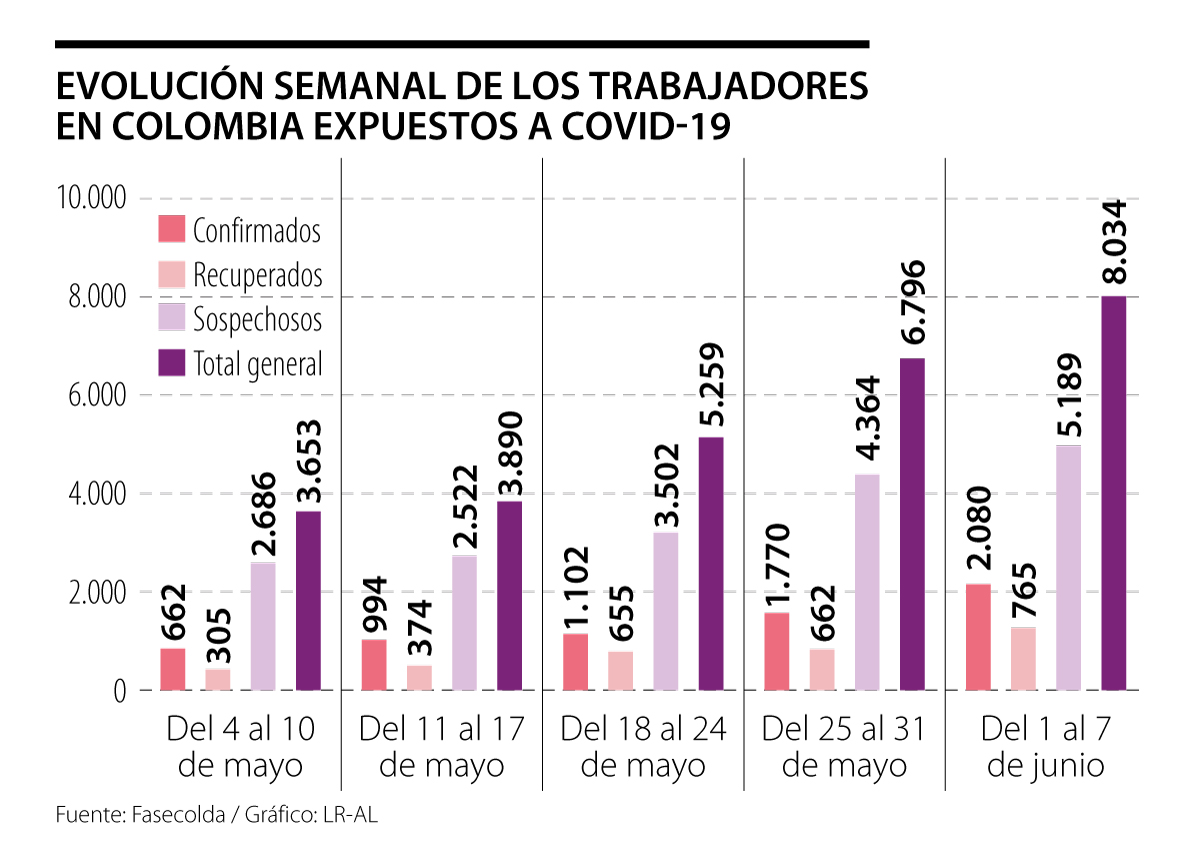 El gremio destacó que los casos confirmados y recuperados del virus de todos los sectores que el Sistema General de Riesgos Laborales ha cubierto equivalen a 20% de los 39.236 casos positivos para covid-19 en Colombia al 7 de junio.