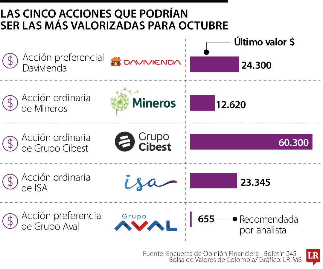 Las acciones como la preferencial Davivienda, ordinaria de Mineros, ordinaria de Grupo Cibest, ordinaria de ISA y preferencial de Grupo Aval son algunas de las más llamativas para que los inversionistas hagan sus operaciones para el mes de septiembre. Se espera una tendencia continuista de crecimiento a partir de lo registrado en los meses de agosto y septiembre.