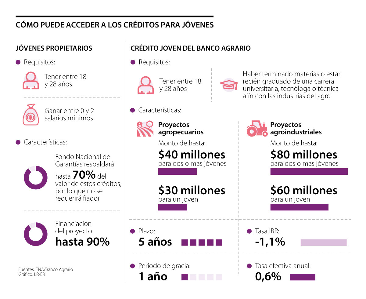 La primera será para proyectos agropecuarios, en la cual el monto será hasta por $40 millones en proyectos en los que haya más de dos jóvenes asociados, o hasta $30 millones en proyectos individuales. El plazo del crédito será de hasta cinco años, con un periodo de gracia a capital de un año y una tasa de IBR -1,1%, es decir, una tasa mínima de 0,6% efectiva anual.