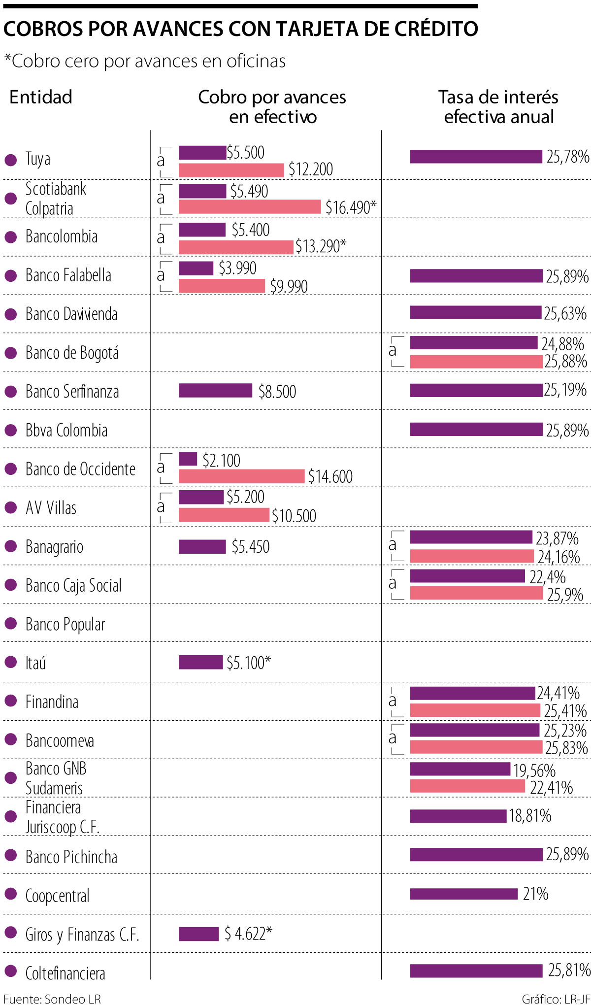 Otros bancos cobran los avances de tarjetas de crédito con un interés efectivo anual o mes vencido; algunos se ajustan a la tasa de interés que maneje el plástico durante ese mes, porcentaje que suele pegarse a la usura; y otros generan un cobro propio por ese tipo de transacciones.