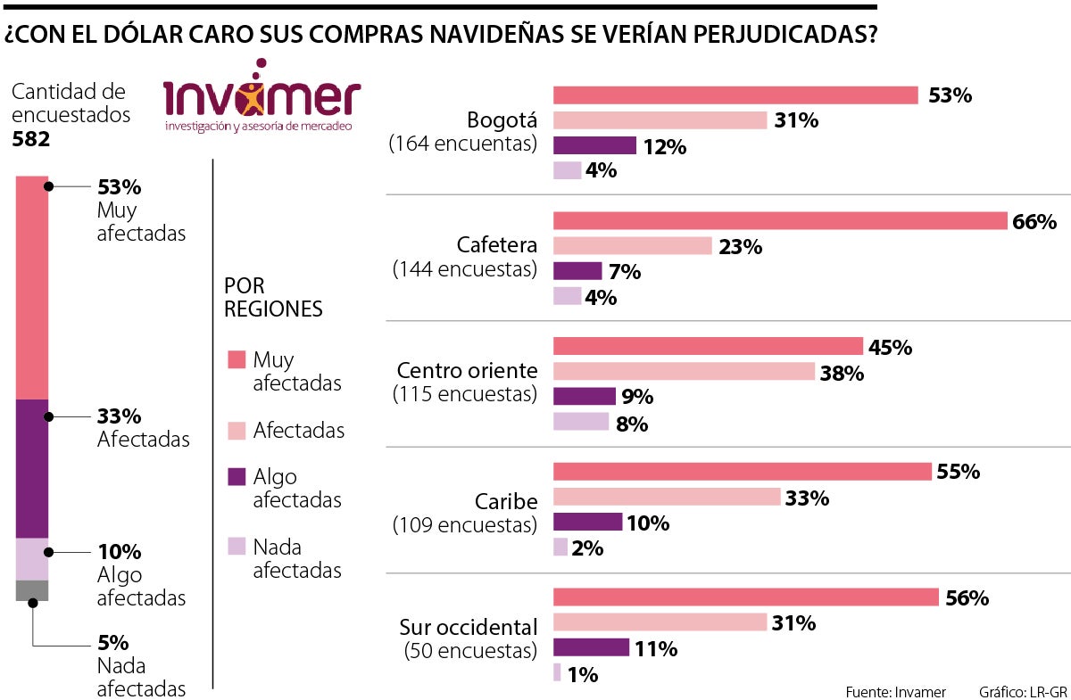 Del total de los encuestados, 53% dijeron que se verán muy afectadas, 33% aseguraron que estaría afectadas, 10% algo impactadas y solo 5% marcaron la respuesta de nada afectadas. La región más pesimista sobre el dólar caro y cómo puede afectar a las compras navideñas es la cafetera, donde 66% de sus encuestados aseguraron que se verán muy afectados con la divisa estadounidense a este precio. Le sigue la región sur occidental (56%) y Bogotá (53%).