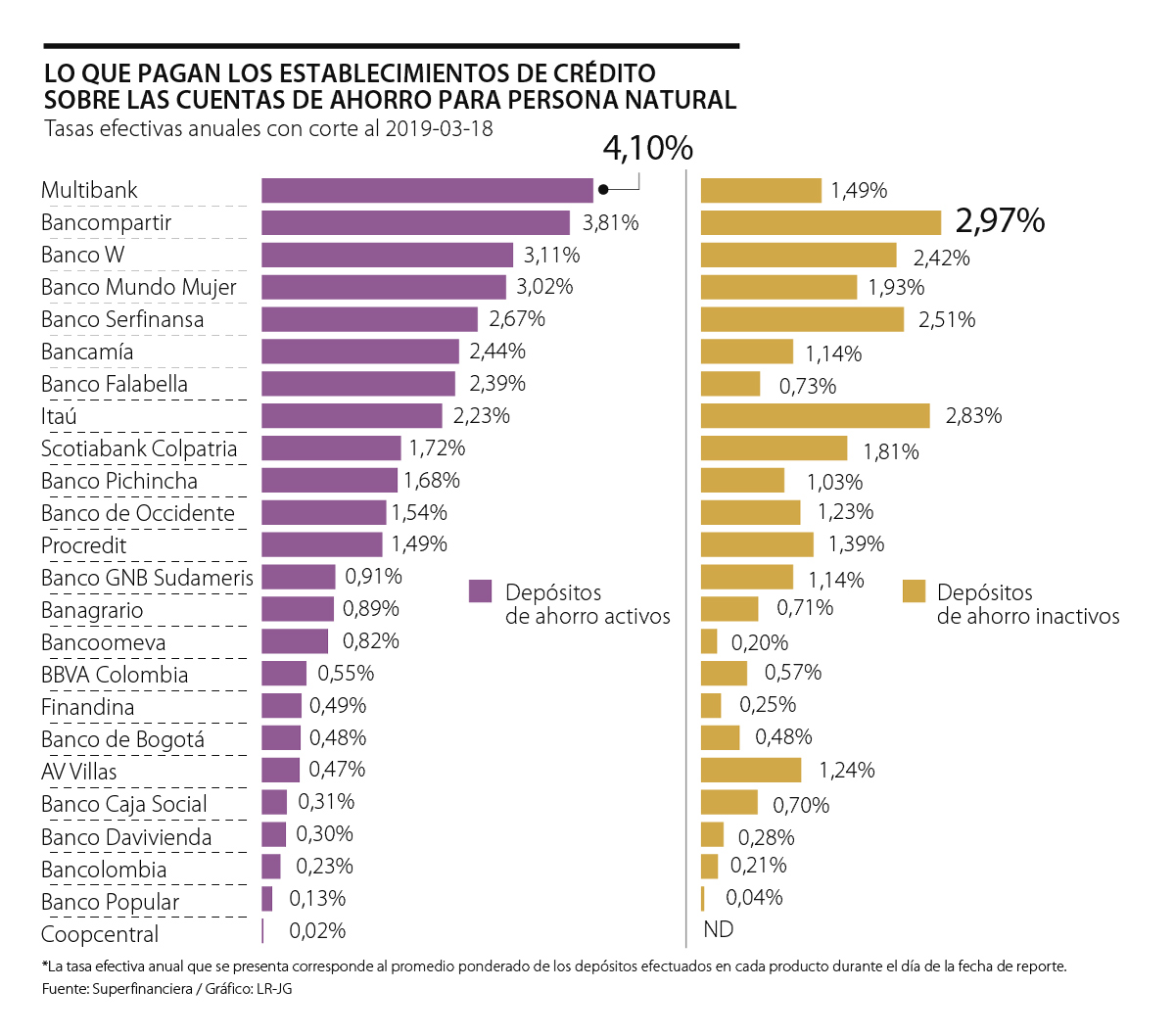 Sin embargo, haciendo uso del simulador de tasas de esta rentabilidad por tipo de depósito de la Superintendencia Financiera, con tasas efectivas anuales con corte al 18 de marzo, se encontró que solamente cuatro bancos ofrecen rendimientos superiores a la inflación de febrero (3,01%) para depósitos de ahorro activos. Estos son Multibank (4,10%), Bancompartir (3,81%), Banco W (3,11%) y Banco Mundo Mujer (3,02%). Vale la pena resaltar que estas tasas corresponden al promedio ponderado de los depósitos efectuados en el producto durante el día de la fecha de reporte.