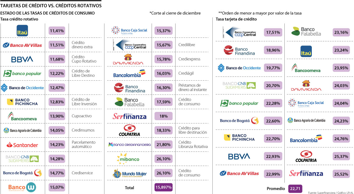 Solo por mencionar algunos nombres, los bancos con las tasas de interés más altas para créditos rotativos son el Banco Mundo Mujer (26,1%); Mibanco (26,1%) y Credifinanciera (21,8%). Mientras que los que tienen los tipos de interés más bajos son el Banco Bbva (11,68%); Banco Av Villas (11,51%) y el Banco Itaú (11,41%).