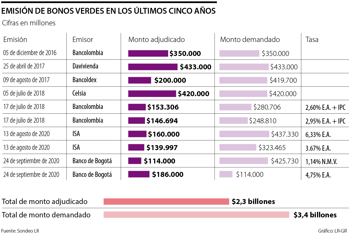Juan David Ballén, director de Investigaciones Económicas de Casa de Bolsa, destacó que “lo que muestran las estadísticas es que las inversiones en este tipo de papeles son más grandes que si uno emitiera un bono tradicional; incluso, dependiendo de las condiciones del mercado, la tasa puede llegar a ser inferior. Lo positivo para quien lo emite es que al final está utilizando los recursos en proyecto que generan la sostenibilidad a largo plazo”.