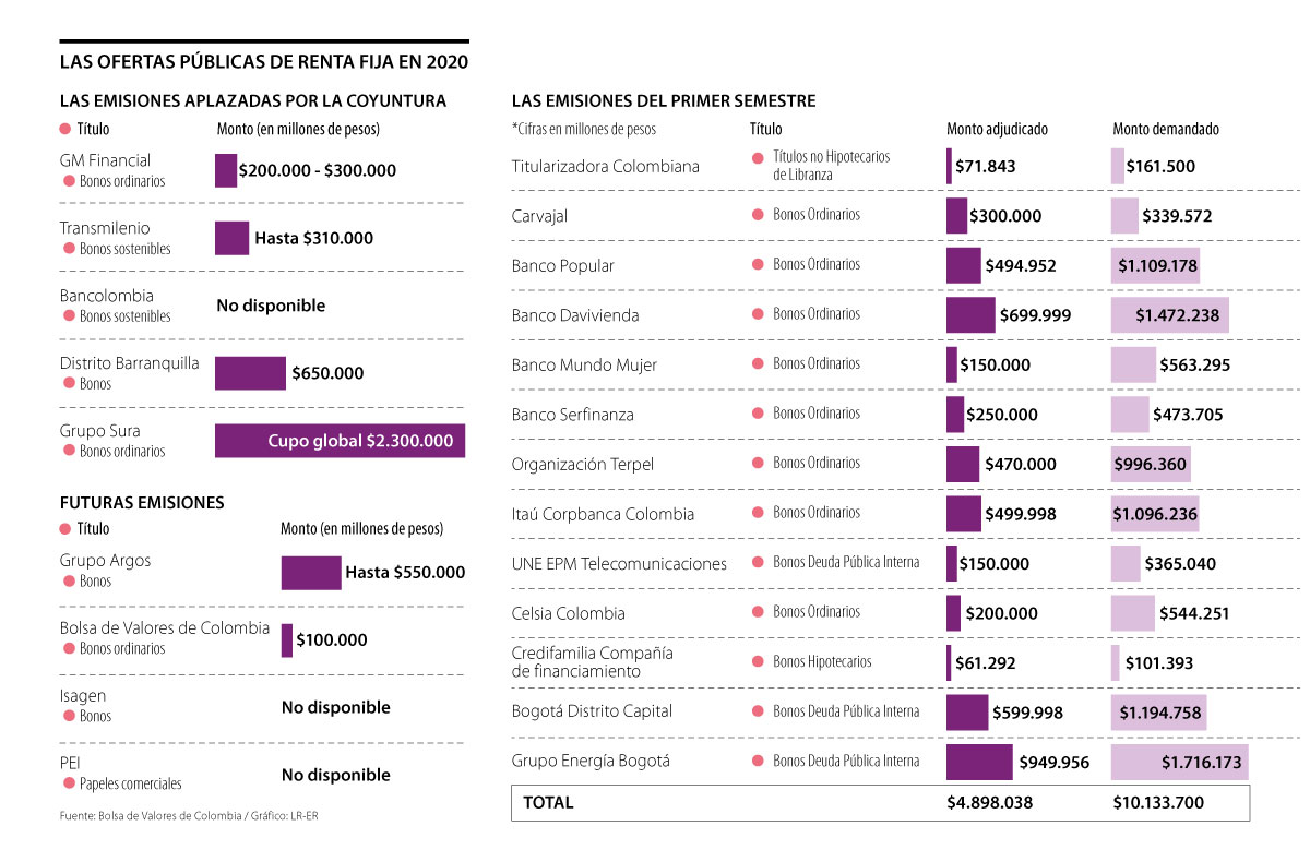 A pesar de los desafíos económicos y tecnológicos que ha causado la pandemia, en lo que va de la cuarentena, cuatro emisores colocaron distintos bonos en el mercado local. El primero en hacerlo fue Celsia, que emitió bonos ordinarios por $200.000 millones. Le siguieron Credifamilia, que colocó bonos hipotecarios por $61.292 millones; Bogotá Distrito Capital y el GEB. En total, en estas cuatro emisiones se adjudicaron $1,81 billones y el monto demandado ascendió a $3,56 billones.