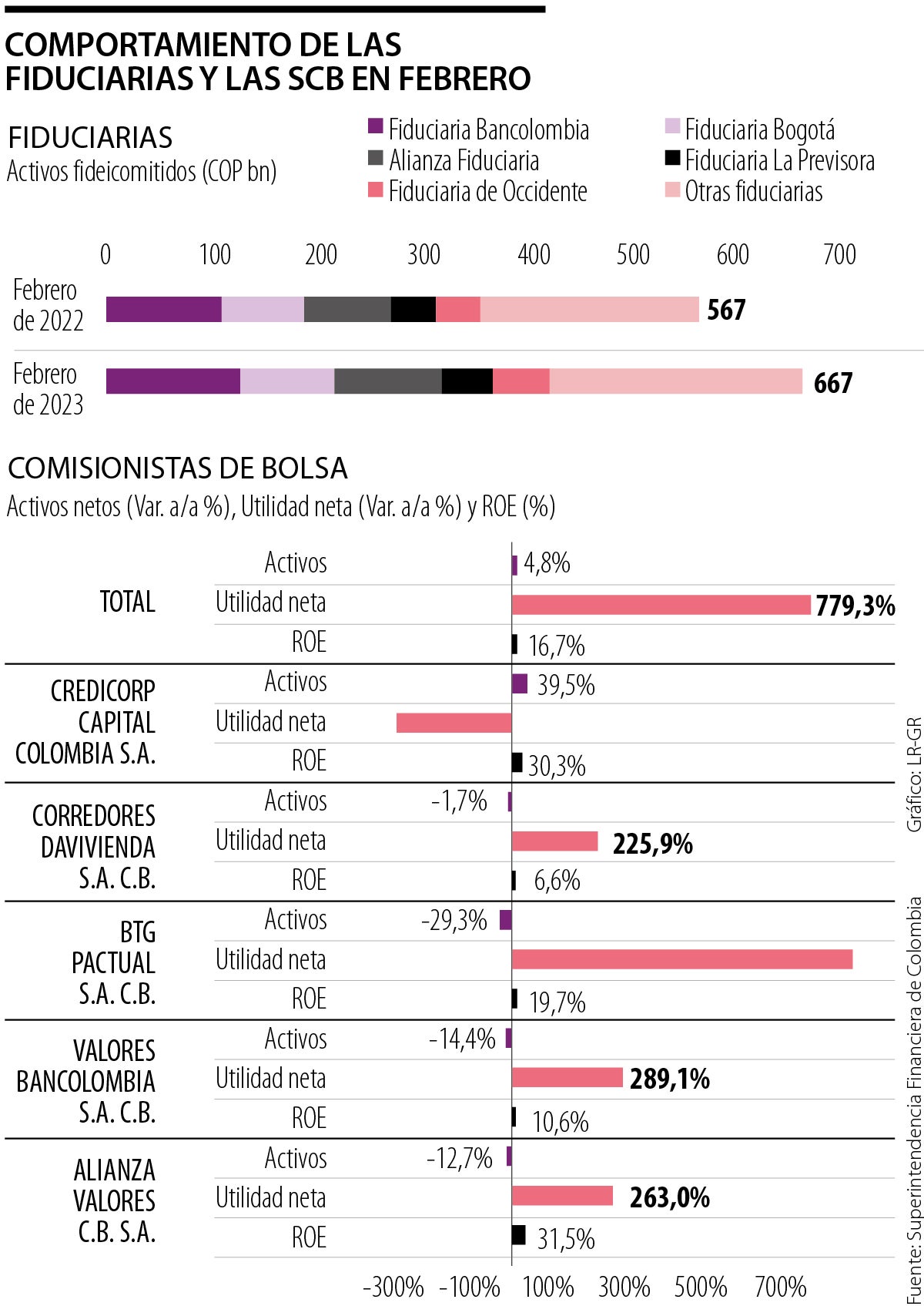 Además, Investigaciones Bancolombia, destacó las fiduciarias con las cuotas más altas del sistema, dentro de las que se encontró a Bancolombia, Bogotá, Alianza, La Previsora y Occidente, que representan 63,6% del total en este periodo, porcentaje que si bien es positivo, se ubica 0,2 puntos porcentuales por debajo de lo registrado en febrero de 2022. La fiduciaria de Bancolombia fue líder, pues tuvo un aumento de 15,1%, seguido de Alianza Fiduciaria, que tuvo un crecimiento anual de 21,7%.