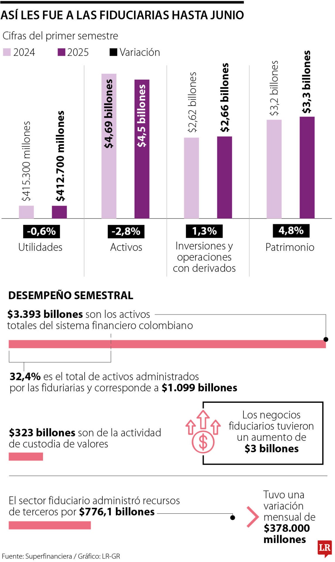 Las fiduciarias fueron el principal administrador de activos del sistema financiero, con $1.009 billones, lo que representa hasta 32,4% del total de los activos del sistema (US$3.393 billones. La Superintendencia Financiera reveló en sus resultados hasta junio que las sociedades fiduciarias tuvieron un crecimiento de 4,8% en materia de patrimonio, así como una ligera caída de 0,6% en las utilidades durante el primer semestre del año.