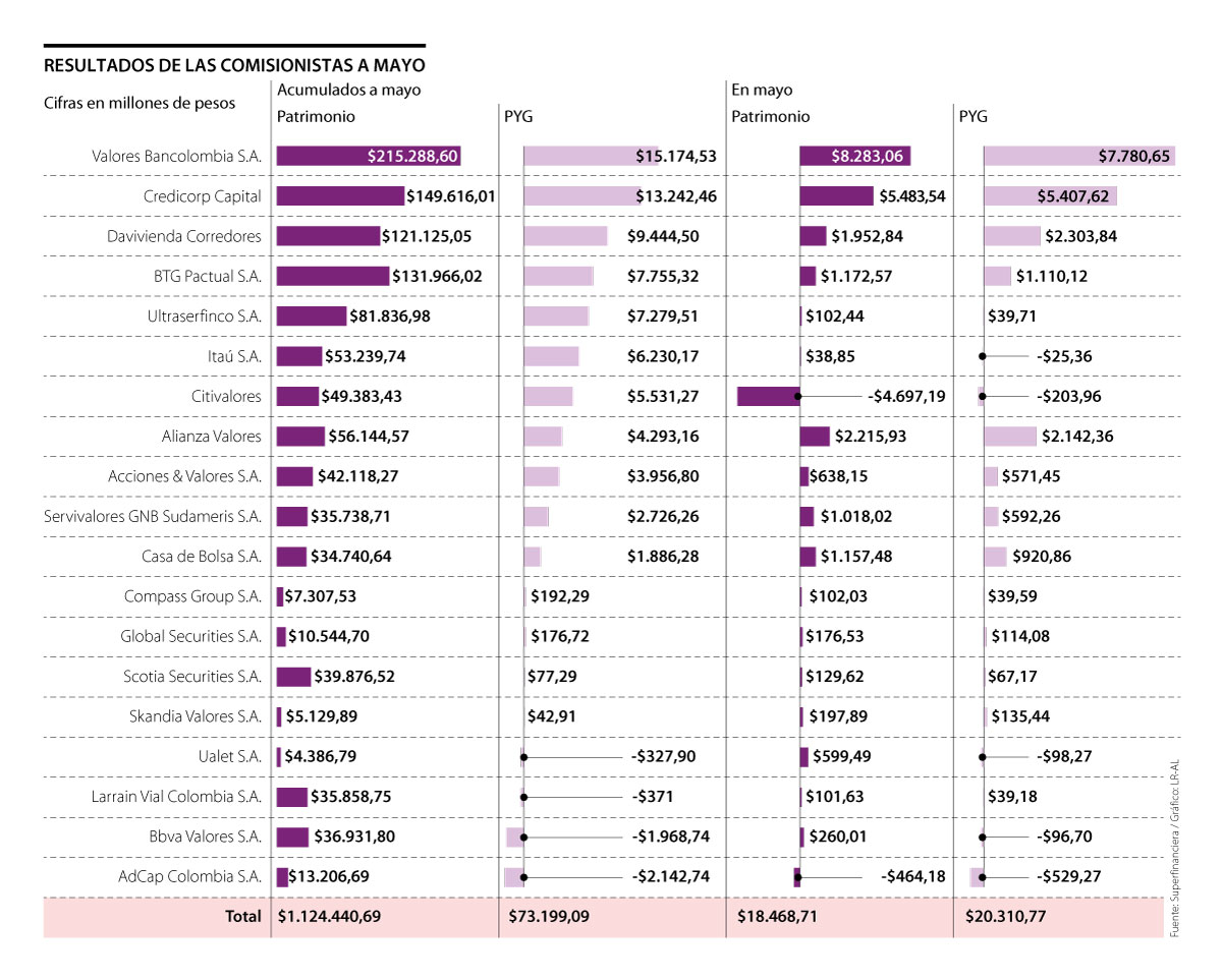 De las comisionistas de Bolsa activas a mayo, Valores Bancolombia, Credicorp Capital, Davivienda Corredores, BTG Pactual y Ultraserfinco fueron las firmas que acumularon mayores ganancias en los primeros cinco meses del año.