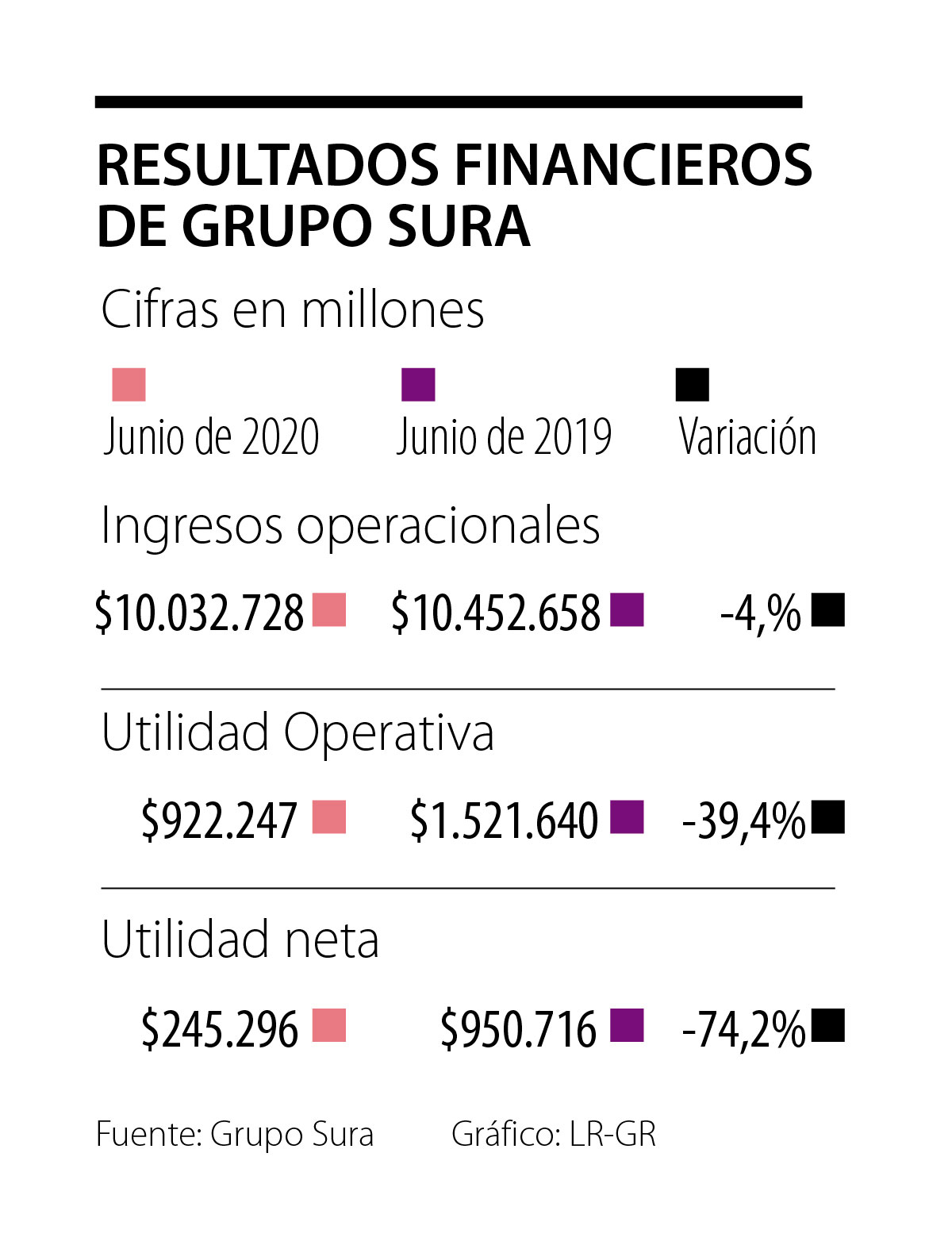 En los seis primeros meses del año, Grupo Sura reportó una utilidad neta de $245.296 millones, 74,2% menos a las ganancias registradas en el primer semestre de 2019; mientras que la utilidad operacional fue de $922.247 millones, 39,4% menos que la registrada en el mismo periodo del año pasado.