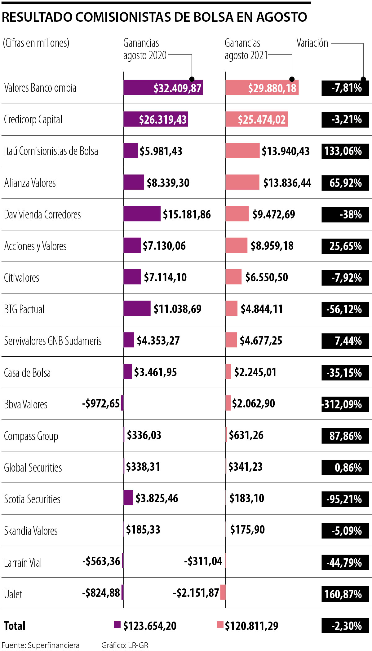 Entre junio y agosto, las comisionistas de bolsa han visto caer sus ganancias respecto al mismo periodo del año pasado. En junio ganaron 5,10% menos; en julio descendieron sus utilidades 5,01%, y, en agosto, registraron una caída de 2,30%.