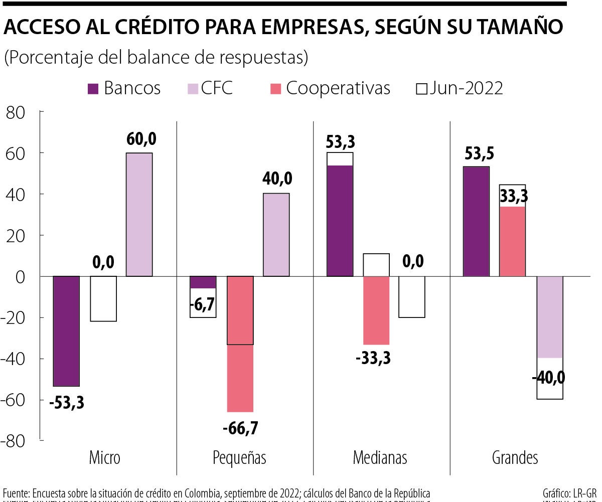 Según los resultados de la Encuesta trimestral sobre la situación del crédito en Colombia, realizada por el Banco de la República, con corte a septiembre de 2022, las empresas grandes mostraron un buen acceso al crédito en bancos y CFC, y un acceso reducido en las cooperativas.