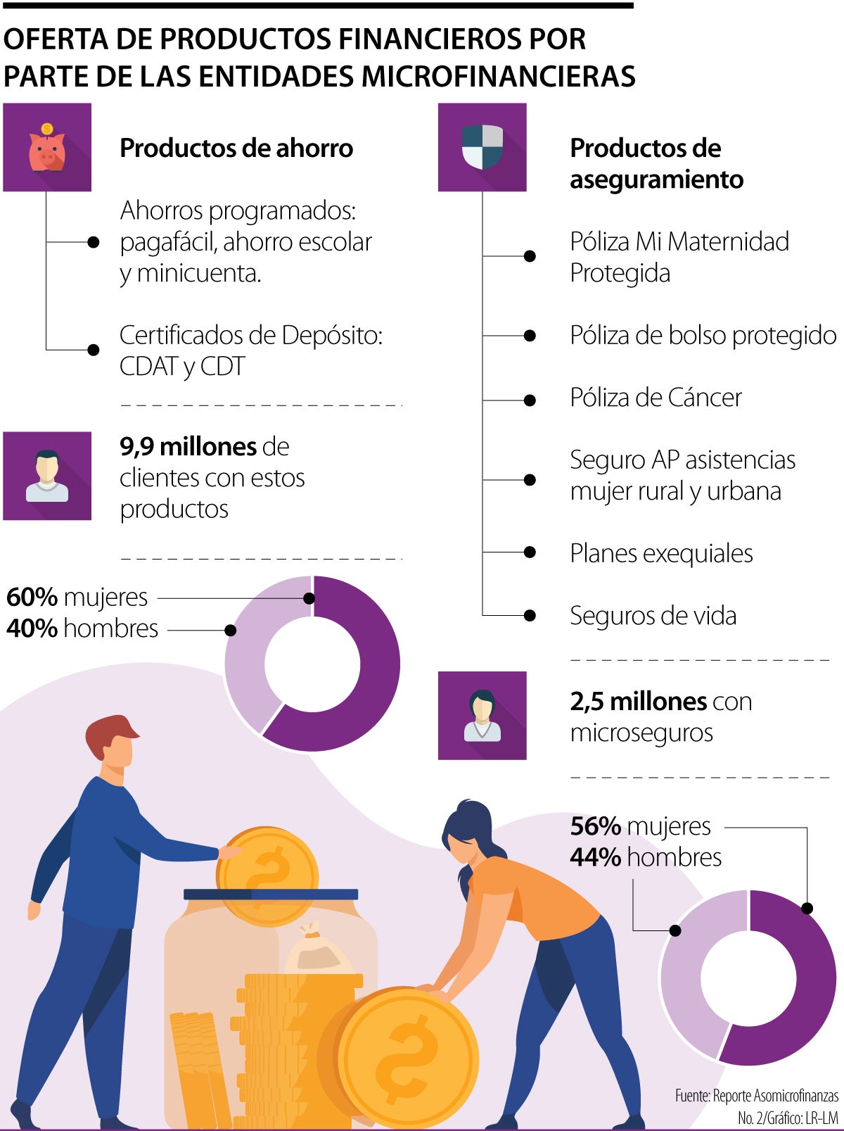 Reportaron que a partir de la información recolectada de 11 entidades, 9,9 millones de clientes están con productos de ahorro, allí, 60% son mujeres y 40% hombres. A su vez, cuentan con 2,5 millones en artículos de aseguramiento, es decir, microseguros, (56% mujeres, 44% hombres), registrado con la información de 17 entidades.