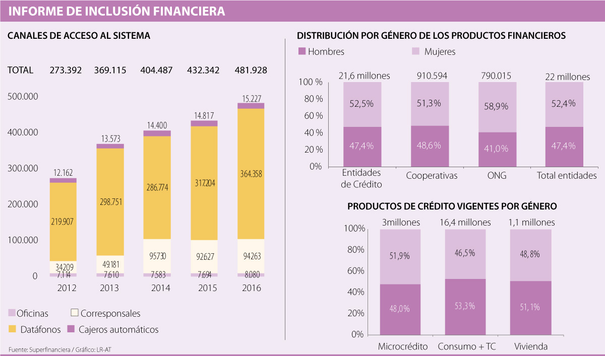 Según el documento, 52,4% de los productos está en manos de las mujeres y 47,4% restante lo tienen los hombres. De hecho, dentro de las entidades que conforman el sistema financiero, en todas hay mayor participación femenina. Por ejemplo, en los establecimientos de crédito 52,5% de los servicios están en poder de mujeres, en cooperativas ese porcentaje llega a 51,3%, y en las ONG, a 58,9%.