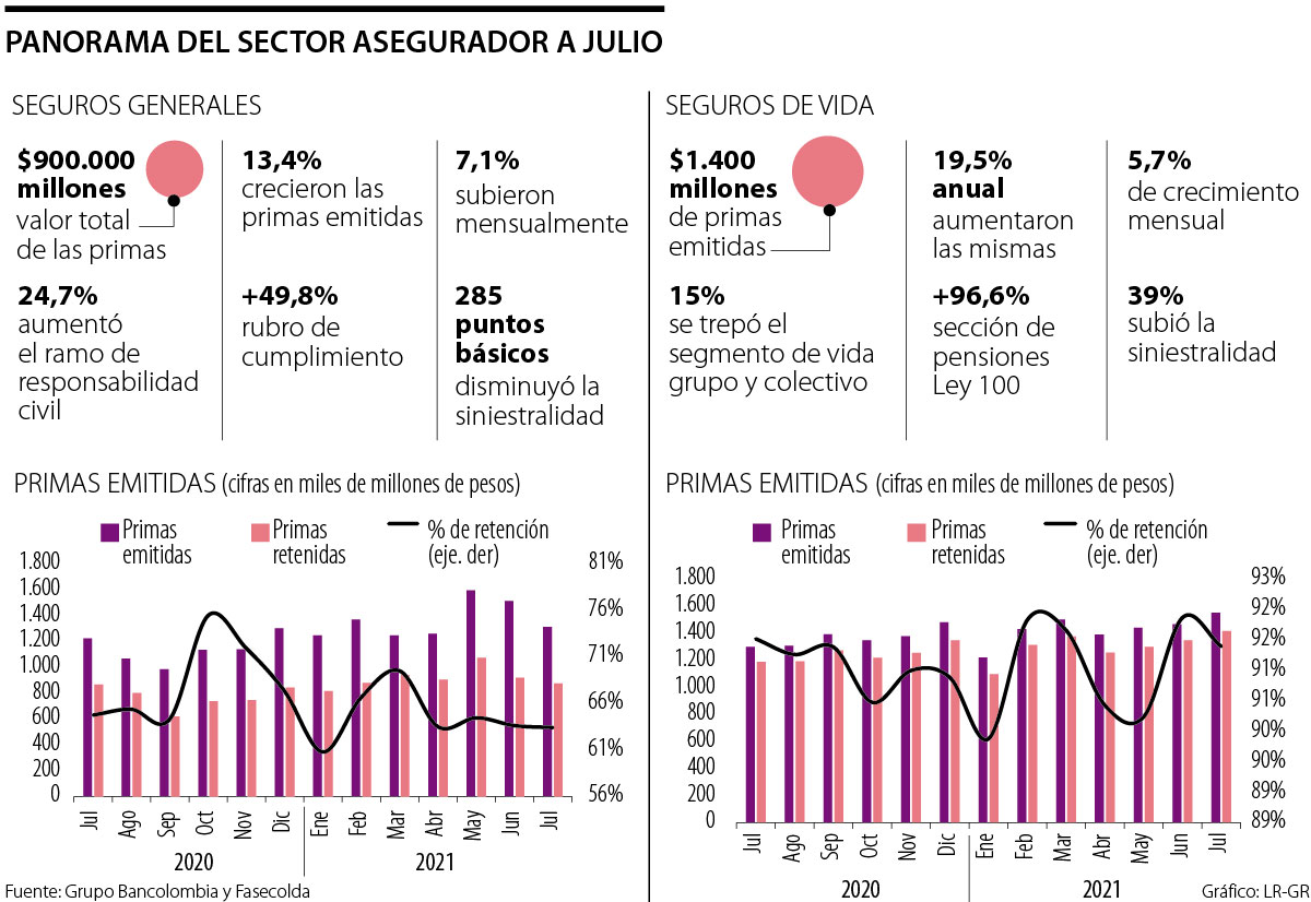 La reactivación de la economía ha llevado al aumento en la emisión de primas del sector asegurador. A julio, dicho indicador de seguros generales se incrementó 13,4% interanual, mientras que mensualmente se evidenció un avance de 7,1%.