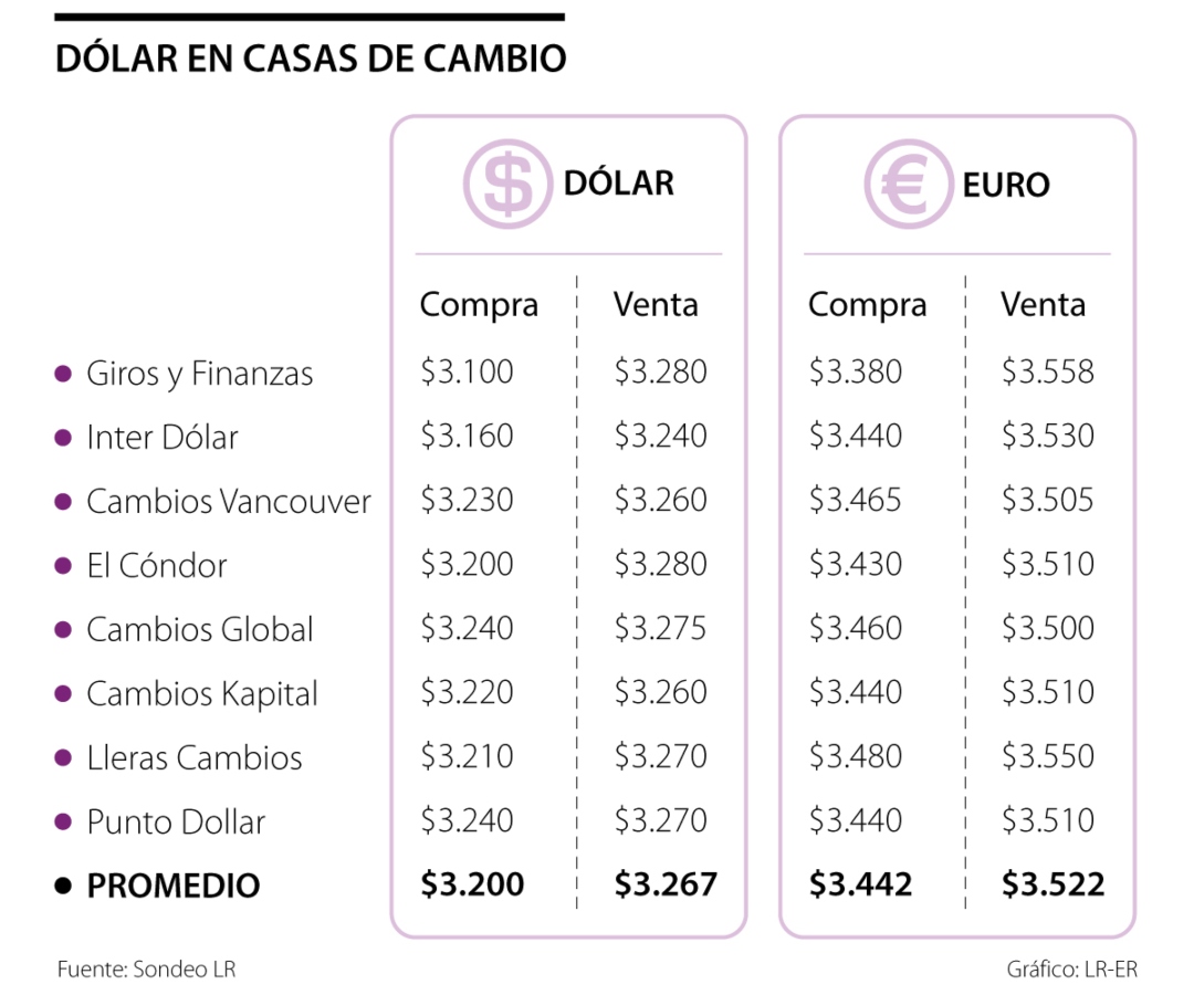 Según un sondeo de LR, las principales casas de cambio del país venderán el euro a un promedio de $3.522 y lo comprarán en $3.442.
