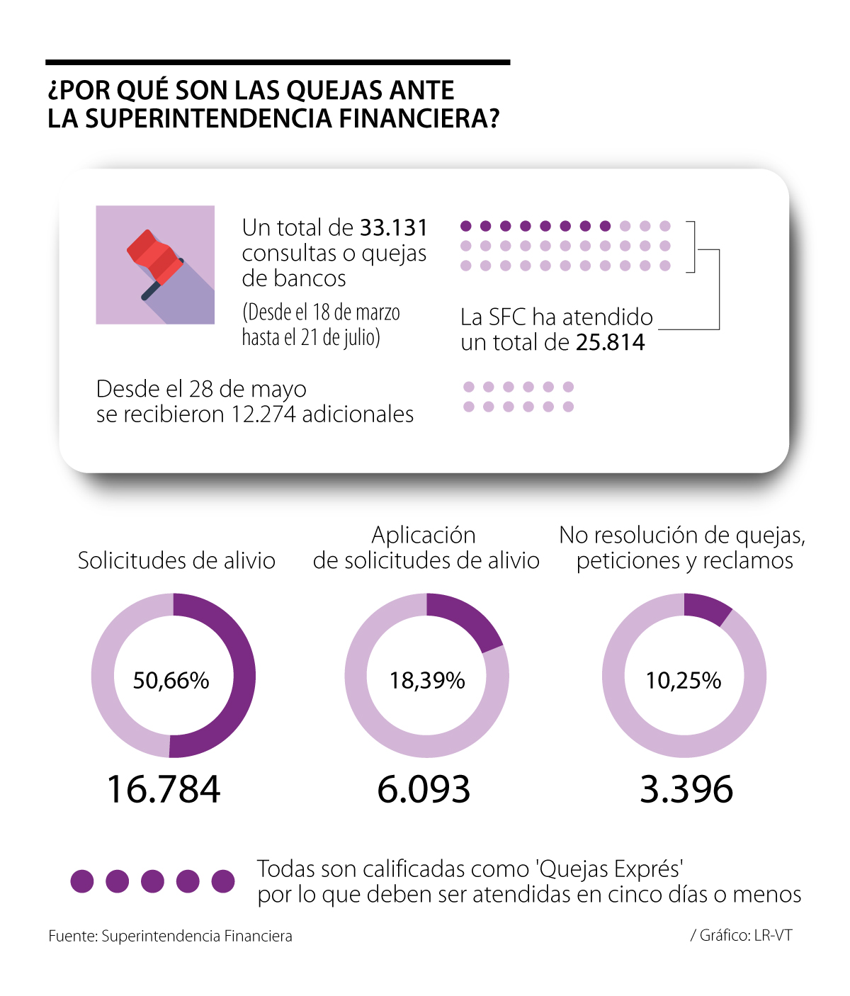 Según explicó la Superfinanciera en el informe de alivios, las quejas asociadas a la temática covid-19 presentadas ante ellos se clasifican como “Quejas Exprés”, las cuales deben ser resueltas por las entidades en un término no mayor a 5 días.