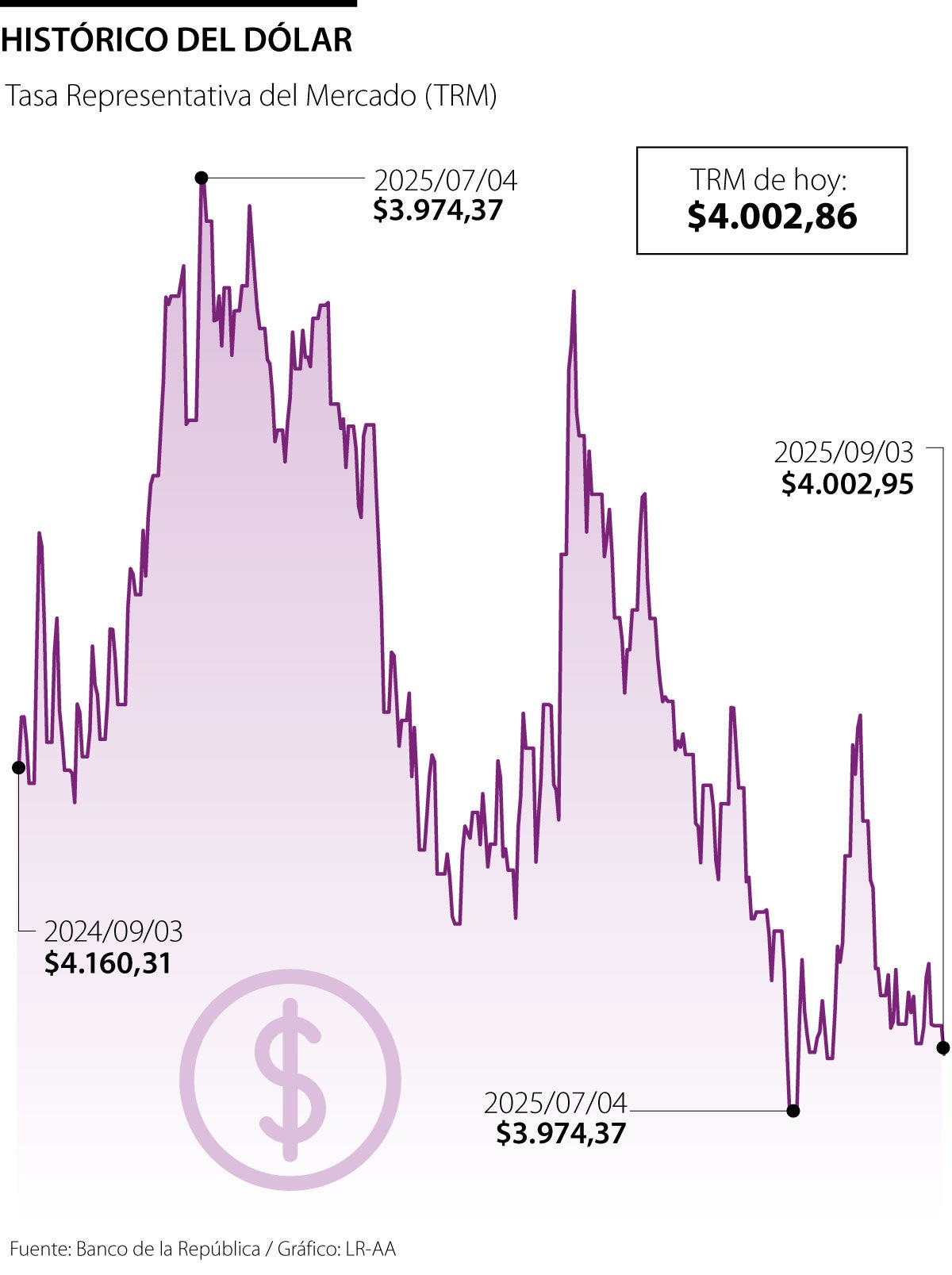 El dólar cerró ayer la jornada en $4.002,95, lo que representó una caída de $13,9 frente a la Tasa Representativa del Mercado, TRM. El indicador certificado del día es de $4.002,86. Por otro lado, el dólar tocó un mínimo histórico que no se veía desde el pasado 7 de julio de este año: su precio más bajo de la divisa fue de $3.984. Entre las razones de la caída están los datos de inflación de Estados Unidos, la disputa legal de los aranceles en EE.UU. y la situación del crédito público en Colombia.