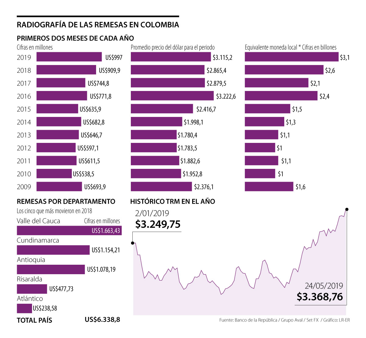Para los dos primeros meses del año, según los datos más actuales del Banco de la República, el volumen de ingresos al país por remesas fue de US$997 millones, una cifra que, con un dólar en promedio a $3.115,2 para el periodo, refleja un nuevo máximo de su valor en pesos, el más alto en una década al generar $3,1 billones, y el cual podría subir si la tasa de cambio sigue al alza.