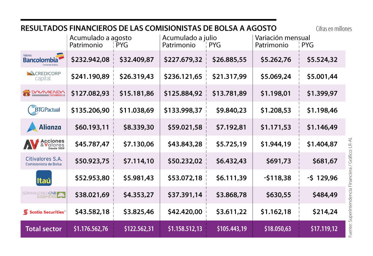 Entre enero y agosto, las comisionistas registraron patrimonios por $1,18 billones. En el octavo mes del año, estos aumentaron $18.050,63 millones. De las firmas vigentes en el mercado, la que tiene el patrimonio más alto es Credicorp Capital, con $241.190,89 millones, seguida de Valores Bancolombia, que cuenta con $232.942,08 millones. En tercer lugar se ubica BTG Pactual, con $135.206,90 millones; en cuarta posición, Davivienda Corredores ($127.082,93 millones) y en quinto lugar, Alianza Valores ($60.192,11 millones).