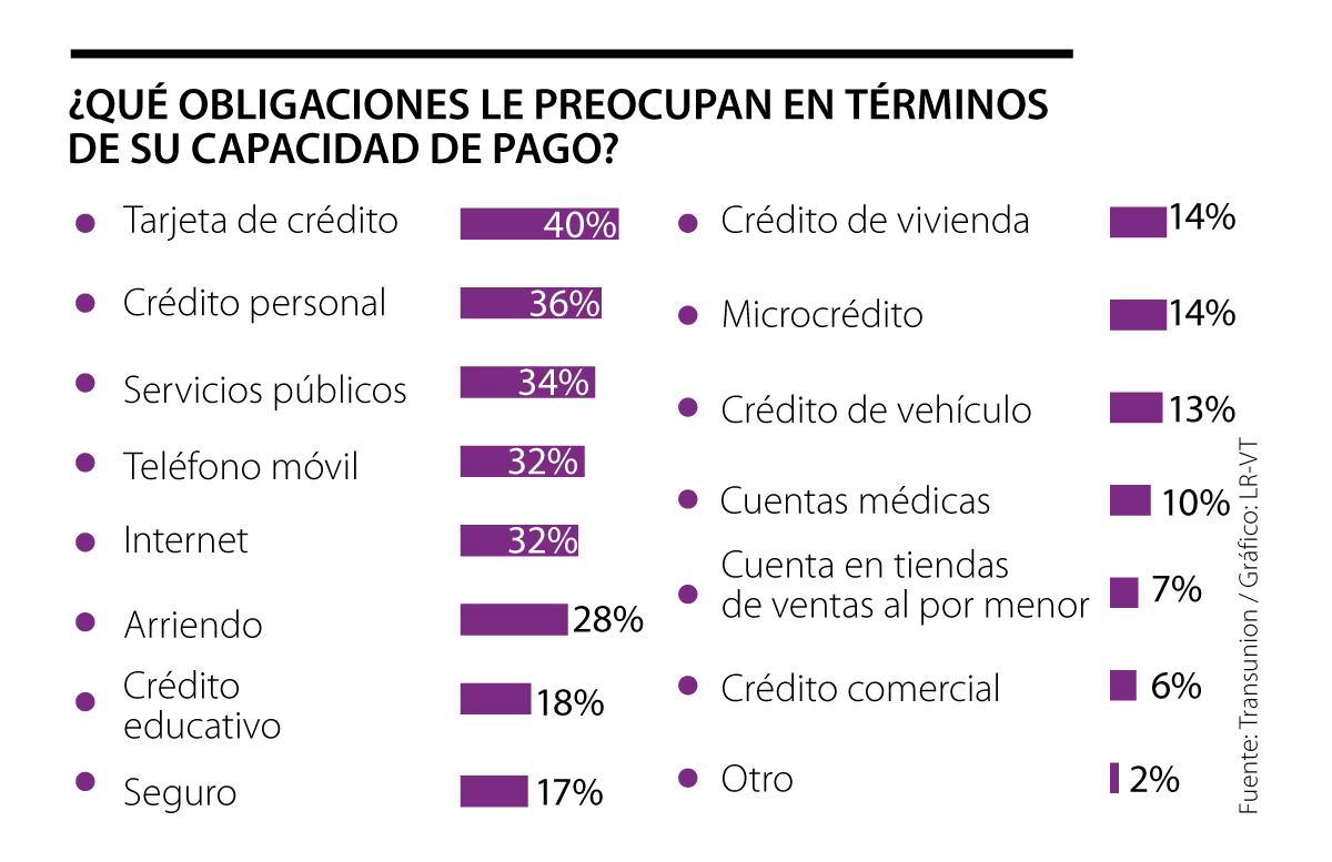 Nueve de cada 10 personas encuestadas por TransUnion aseguraron que están preocupados por pagar sus obligaciones financieras. Las tarjetas de crédito es lo que más trasnocha a 40% de las personas indagadas, seguido del crédito personal (36%) y los servicios públicos (34%). TransUnion también resaltó que “36% de los consumidores afectados indica que utilizarán sus ahorros para para pagar sus obligaciones”.
