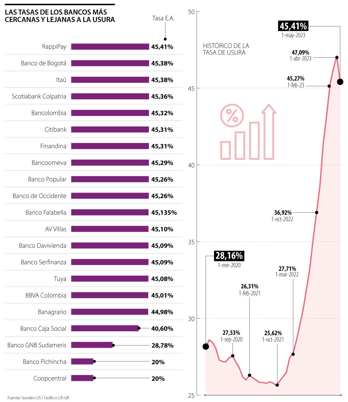 Precisamente para este mes, y luego de un año y medio, la usurasorprendió bajando 168 puntos básicos respecto al mes anterior, pues la Superintendencia Financiera de Colombia anunció que para mayo esta tasa sería de 45,41% efectivo anual.