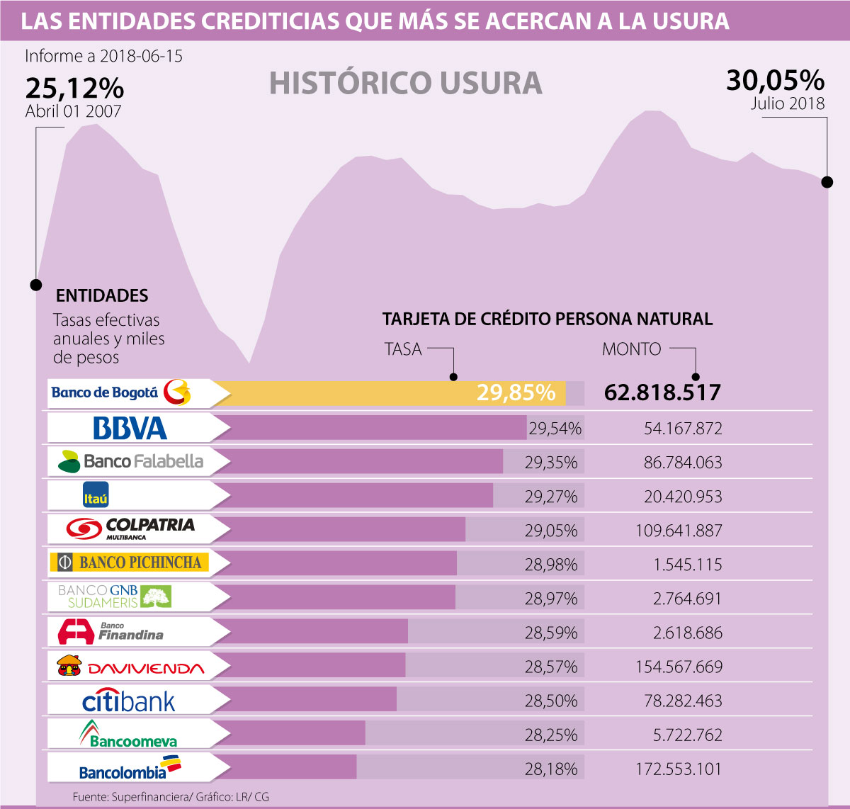 Teniendo en cuenta este nuevo tope, el Banco de Bogotá y Bbva Colombia son las entidades que más se acercan al límite, ya que manejan una tasa de interés, a 15 de junio de este año, de 29,85% y 29,54%; respectivamente.