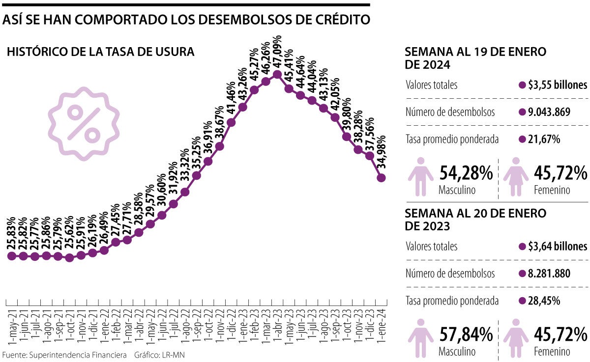 Hace un año, en la semana que terminó el 20 de enero de 2023, se hicieron 498.562 de desembolsos, por $6,91 billones. La tasa promedia ponderada, ene se momento, fue de 26,72% E.A. Si se desglosa por tipo de crédito, la tasa de microcrédito para las microempresas fue de 38,12% E.A, un segmento al que se le suele cobrar más alto debido al riesgo que representa. Asobancaria espera que para este año la cartera tenga una senda de recuperación, aunque será un proceso lento en medio del menor crecimiento económico que habrá.