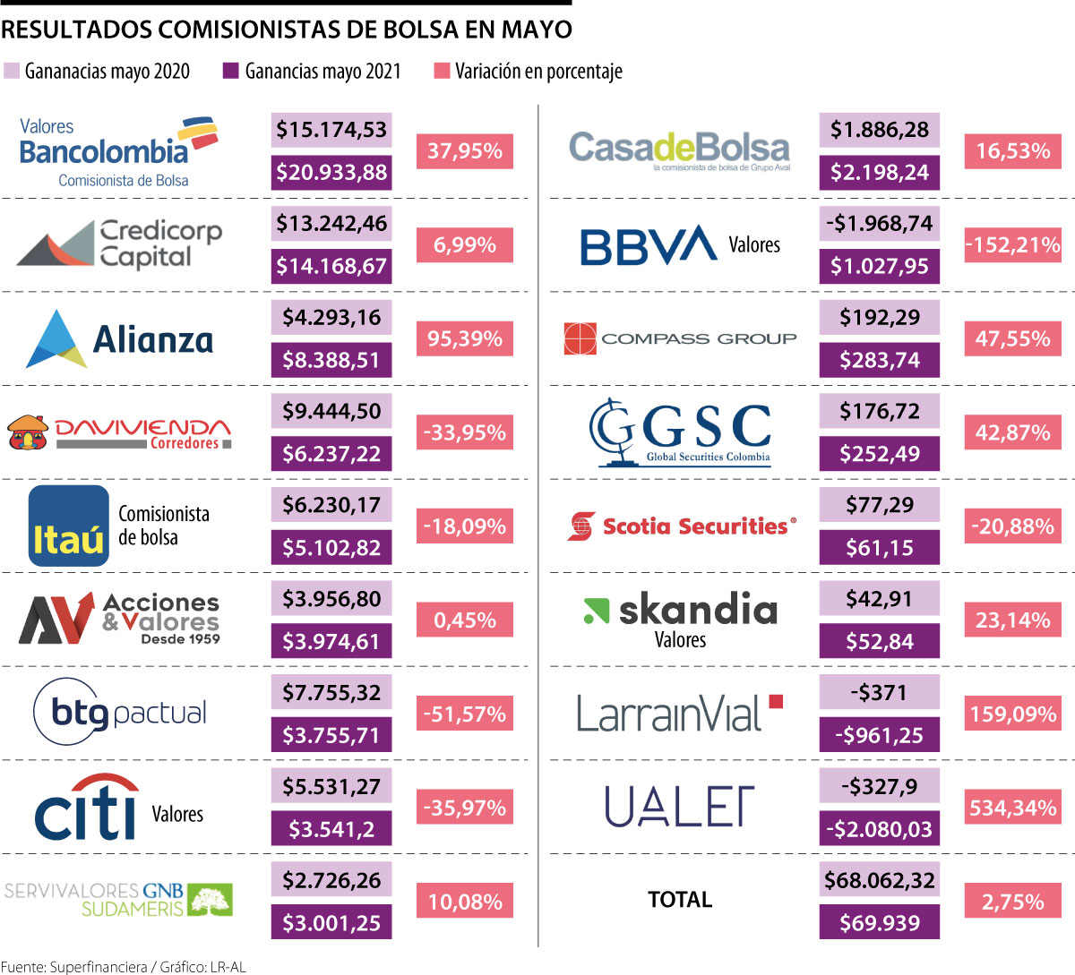Las sociedades que más obtuvieron ganancias fueron Valores Bancolombia, con $20.933 millones; Credicorp Capital, con $14.168 millones; Alianza Valores, con $8.388 millones; Davivienda Corredores, con $6.237 millones; e Itaú con $5.102 millones.