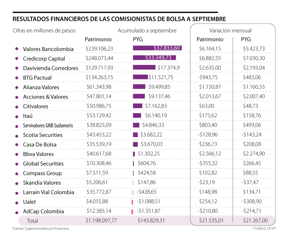 En cambio, entre las comisionistas de bolsa que reportaron pérdidas en septiembre están Ualet (-$308,90 millones), Adcap Colombia (-$214,71 millones), Scotia Securities (-$143,24 millones) y Skandia Valores (-$37,47 millones).