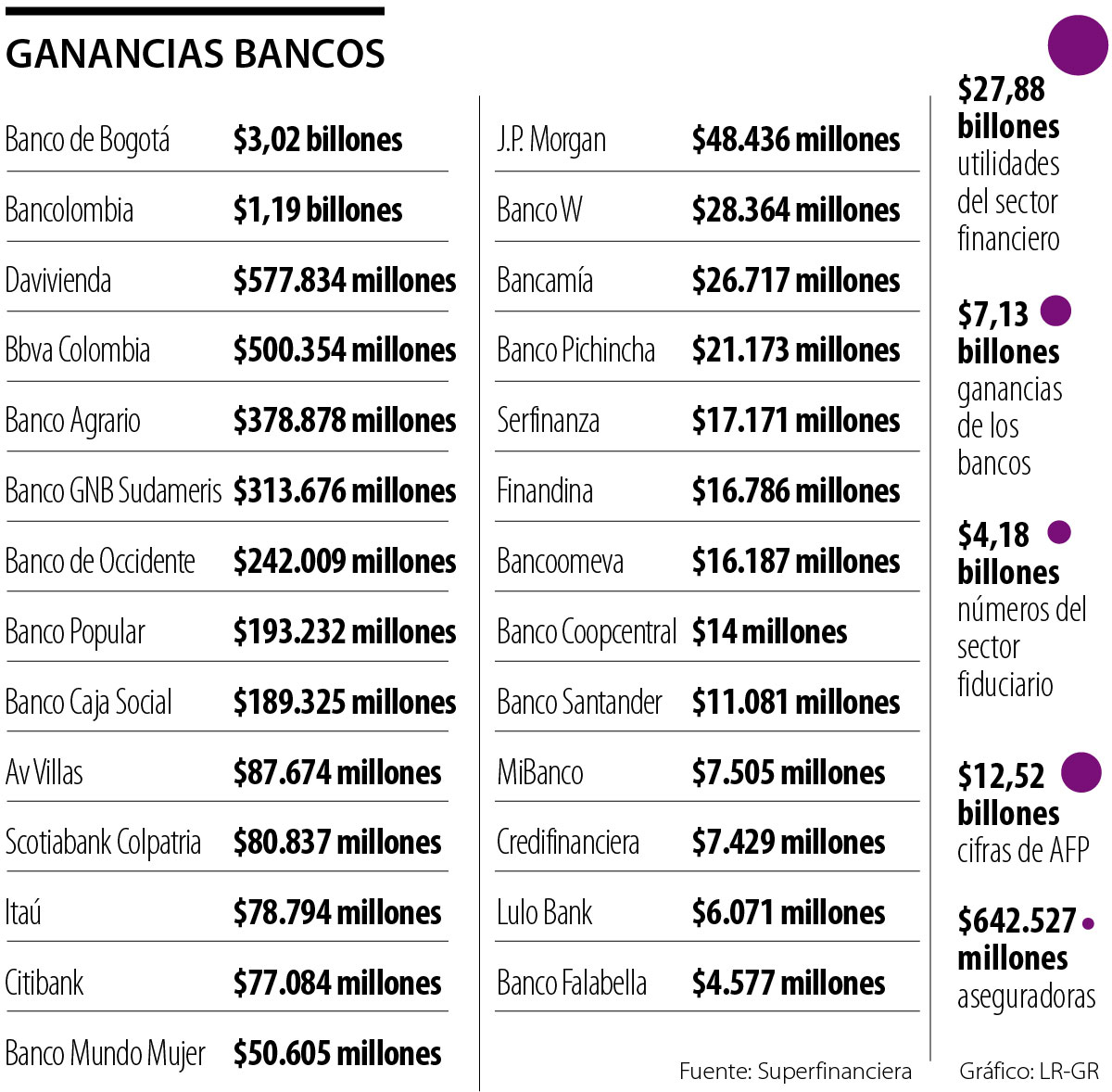 La entidad que más ganancias registró durante el periodo fue Banco de Bogotá, con utilidades por $3,02 billones; seguido por Bancolombia, con $1,19 billones; Davivienda, con $577.834 millones y Bbva Colombia, con $500.354 millones.